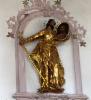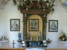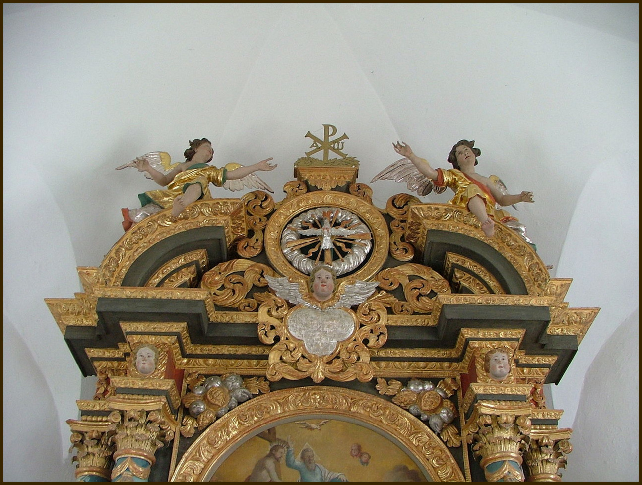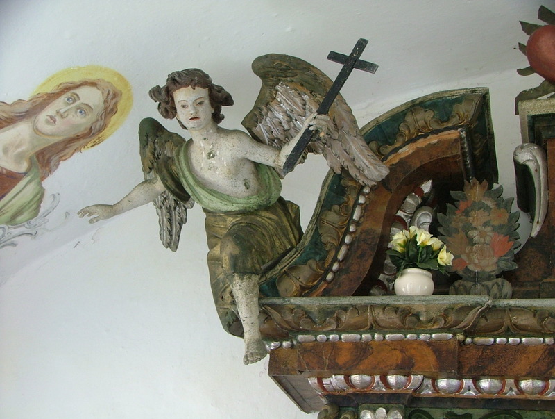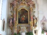 Der marmorierte Altar stammt aus der Erbauungszeit. Die stehende Holzfigur des Gottvaters aus dem zweiten Viertels des 18. Jahrhunderts wird von zwei Pilastern eingerahmt. Auf Konsolen befindet sich rechts die Figur der Heiligen Cäcilie und links der Heiligen Barbara. Zwei Engel mit Symbolen der göttlichen Tugenden sind auf den geschweiften Giebelstücken. Eine gotische Holzfigur um 1460 wurde durch nachträgliche Übermalung und mit neuen Attributen zur Heiligen Kreszentia.
