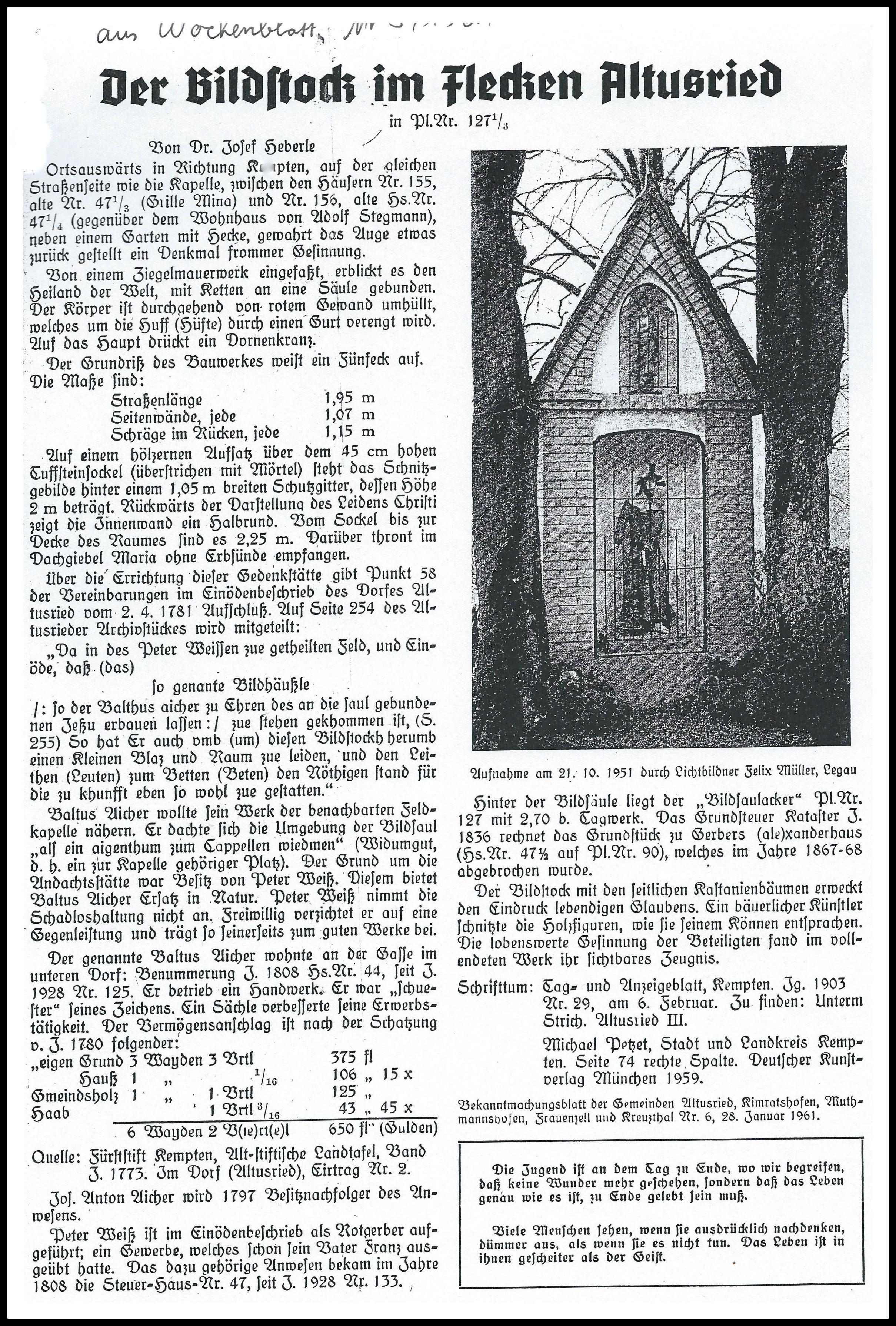 1961 Der Bildstock im Flecken Altusried, Bericht von Dr. Heberle im Blättle Nr.: 5-1961