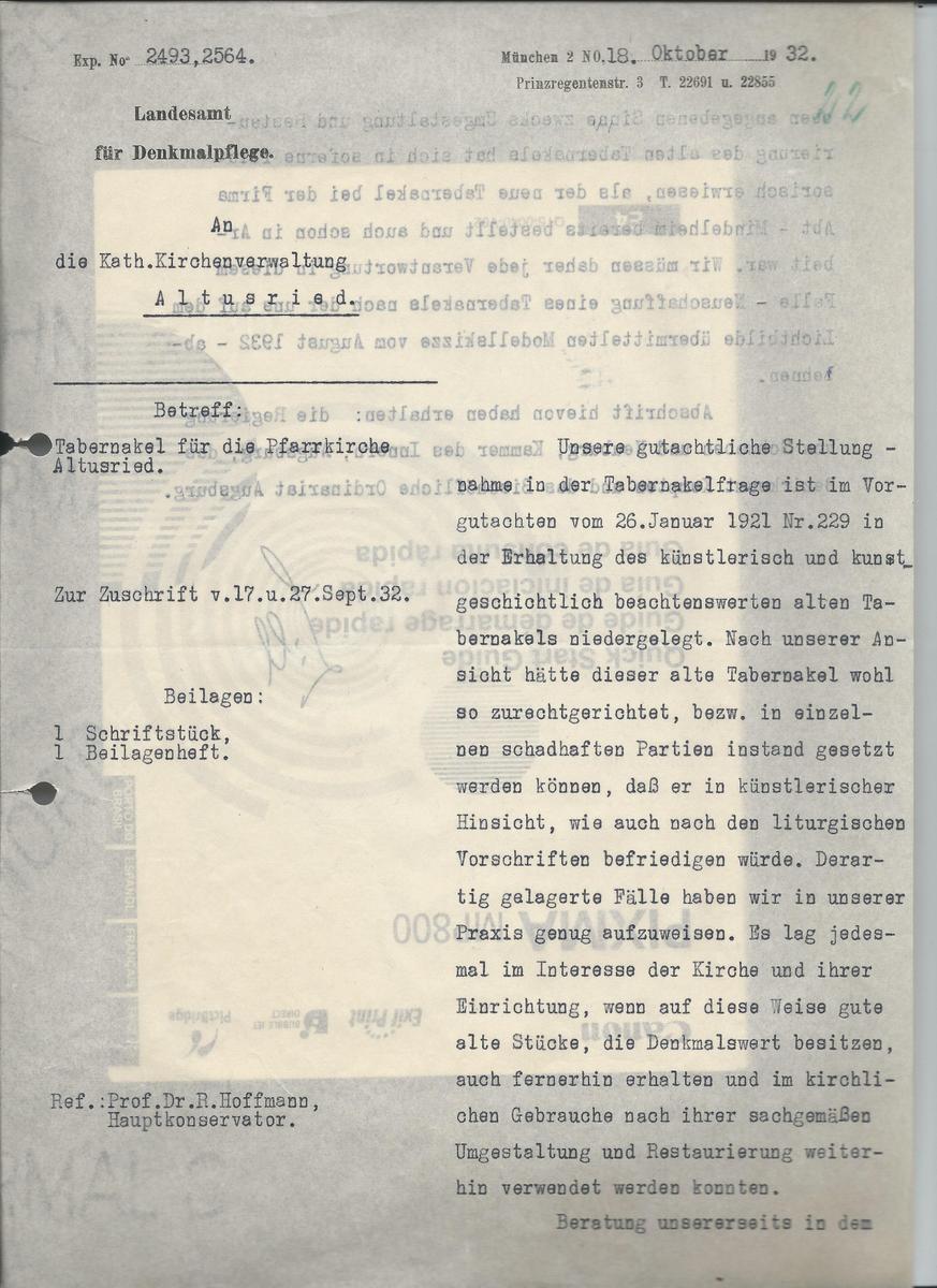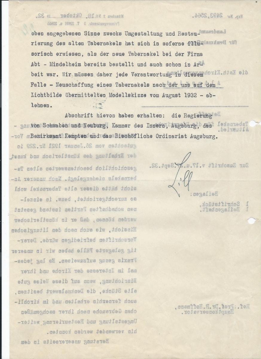 1932 Pfarrer Sälzle bestellt einen neuen Tabernakel
