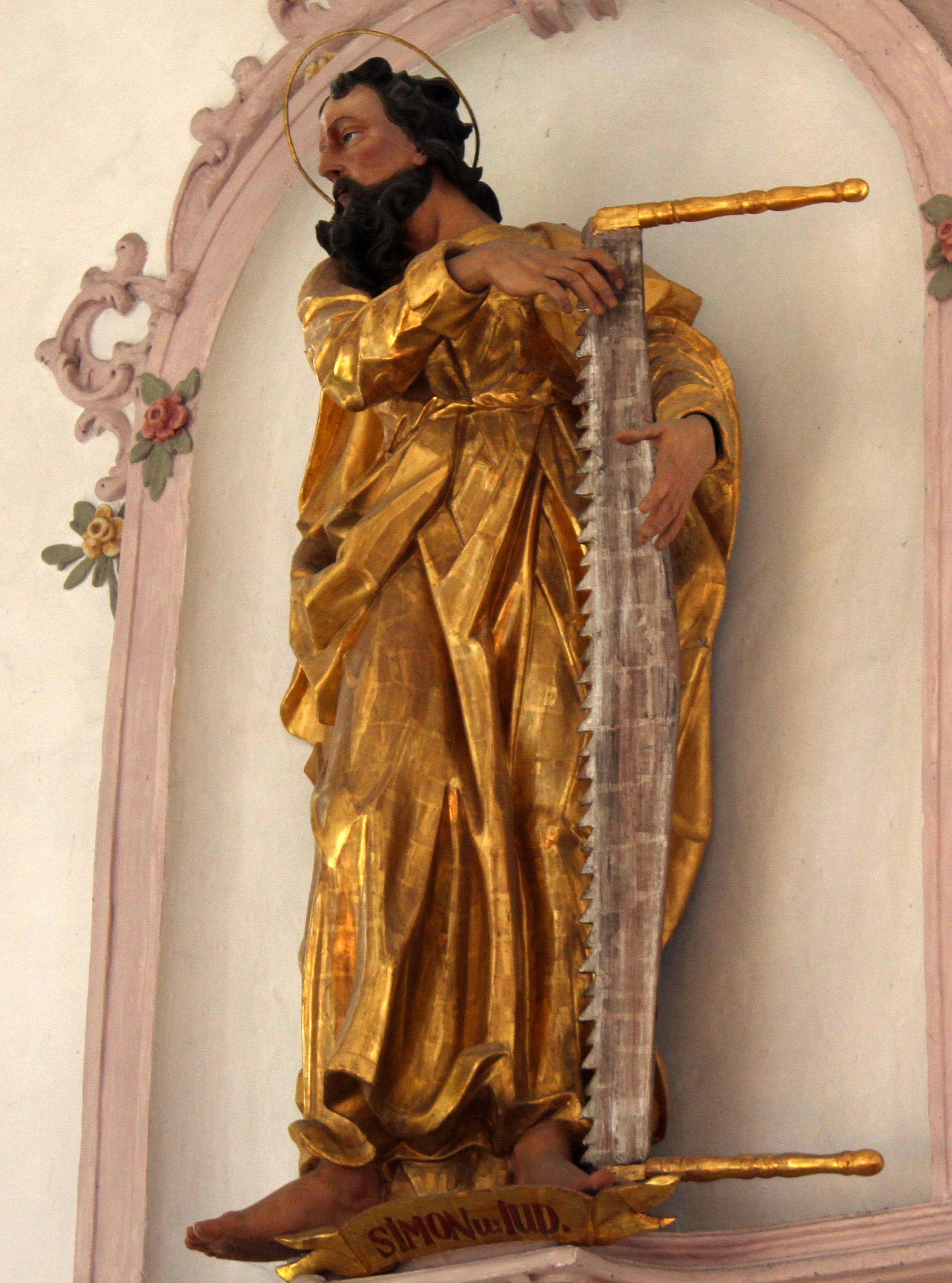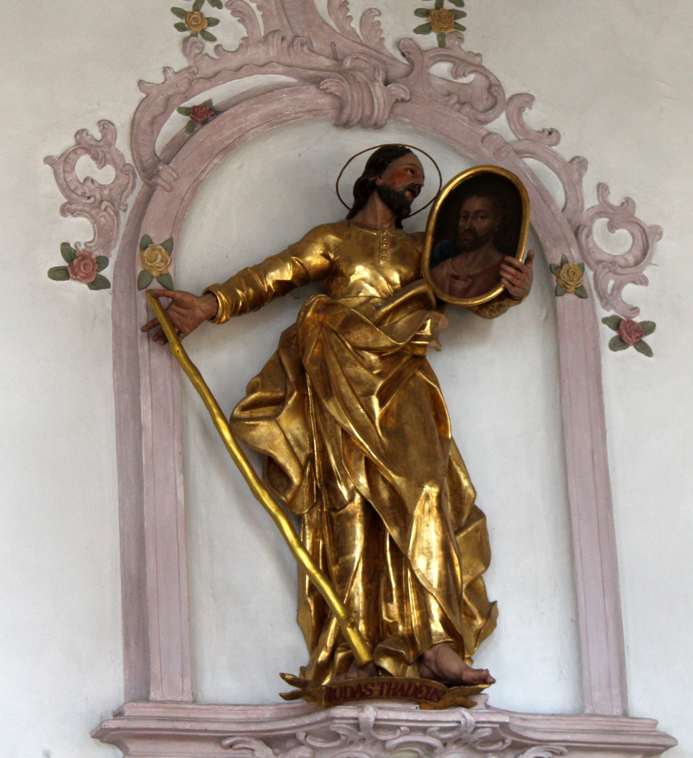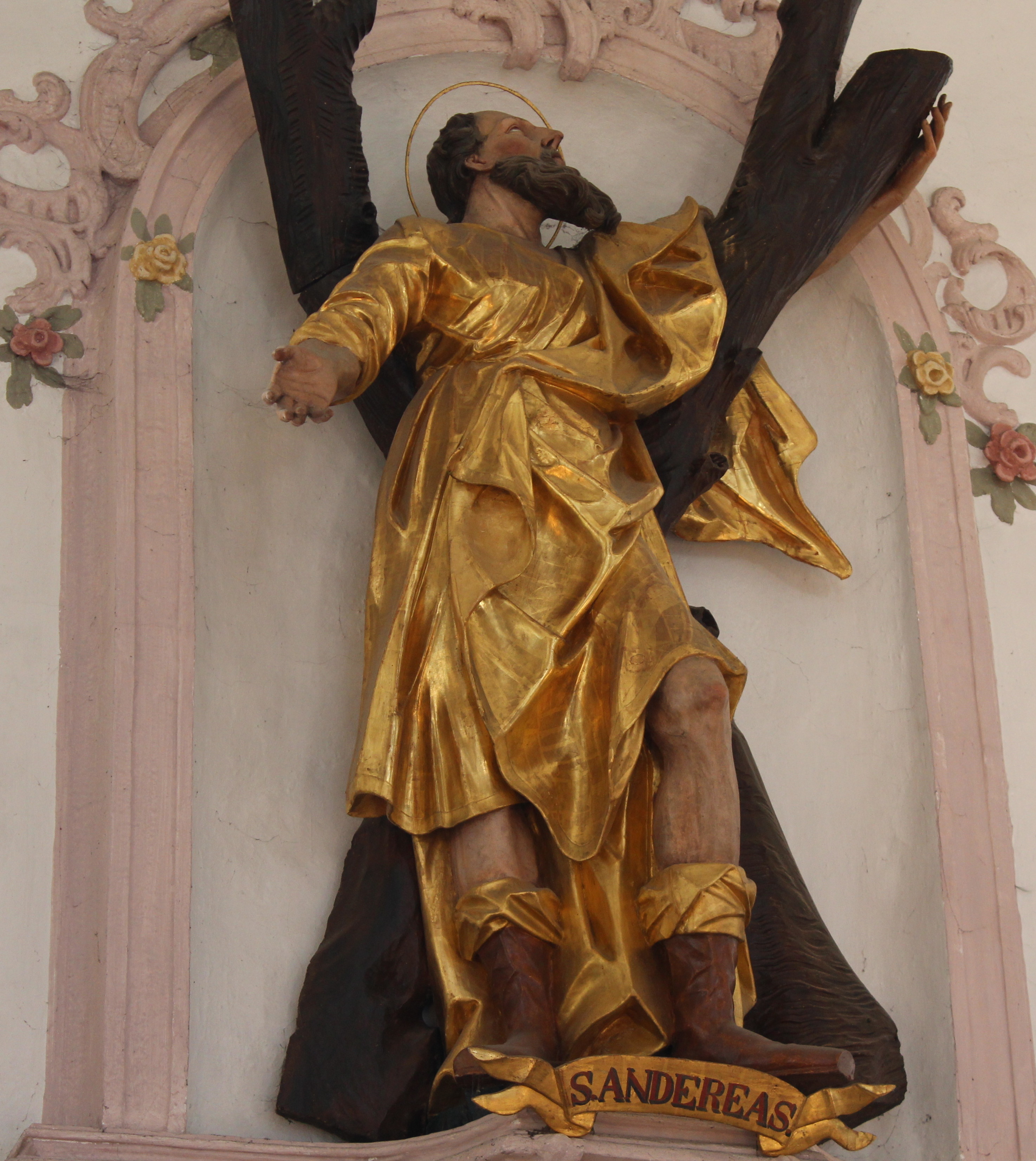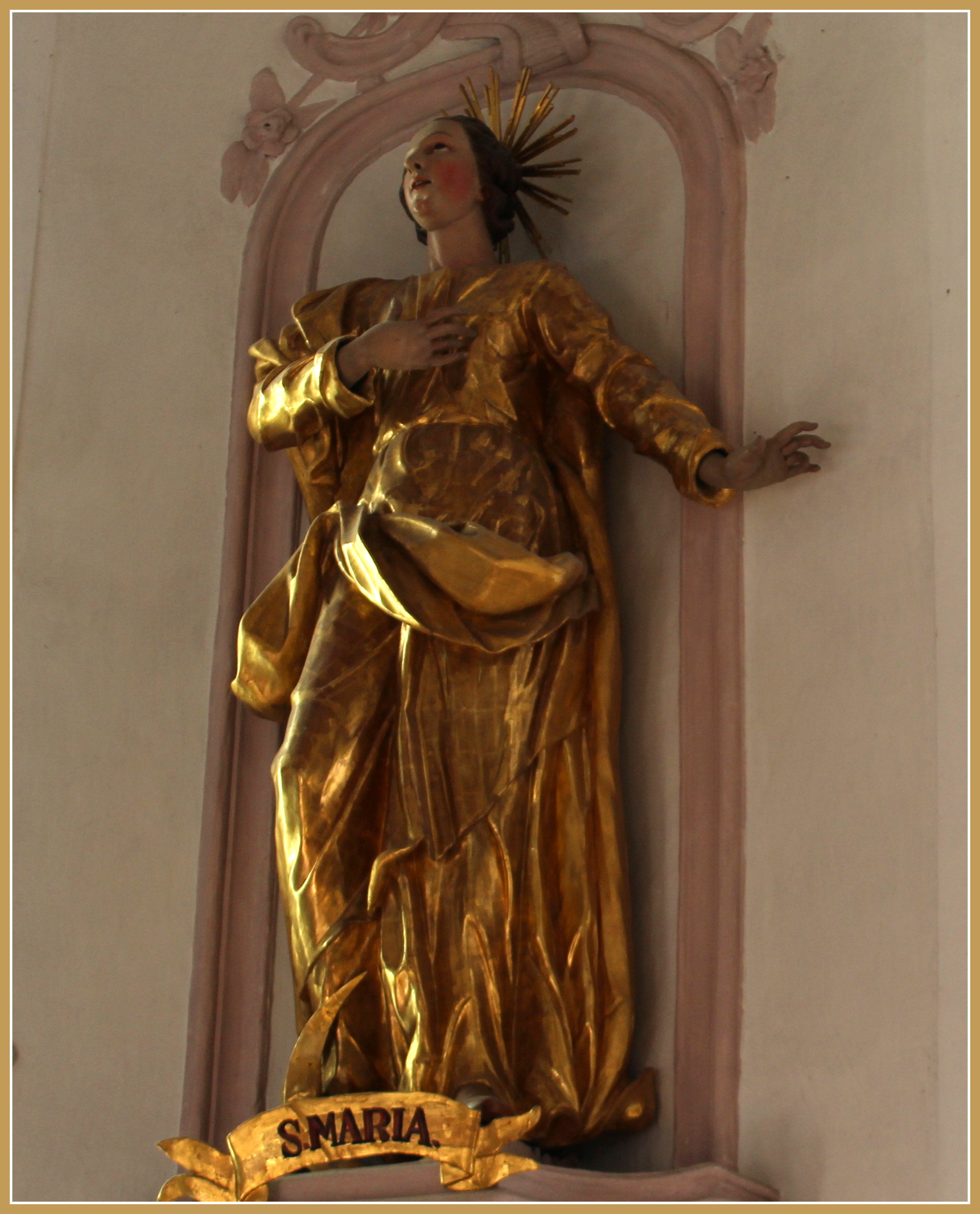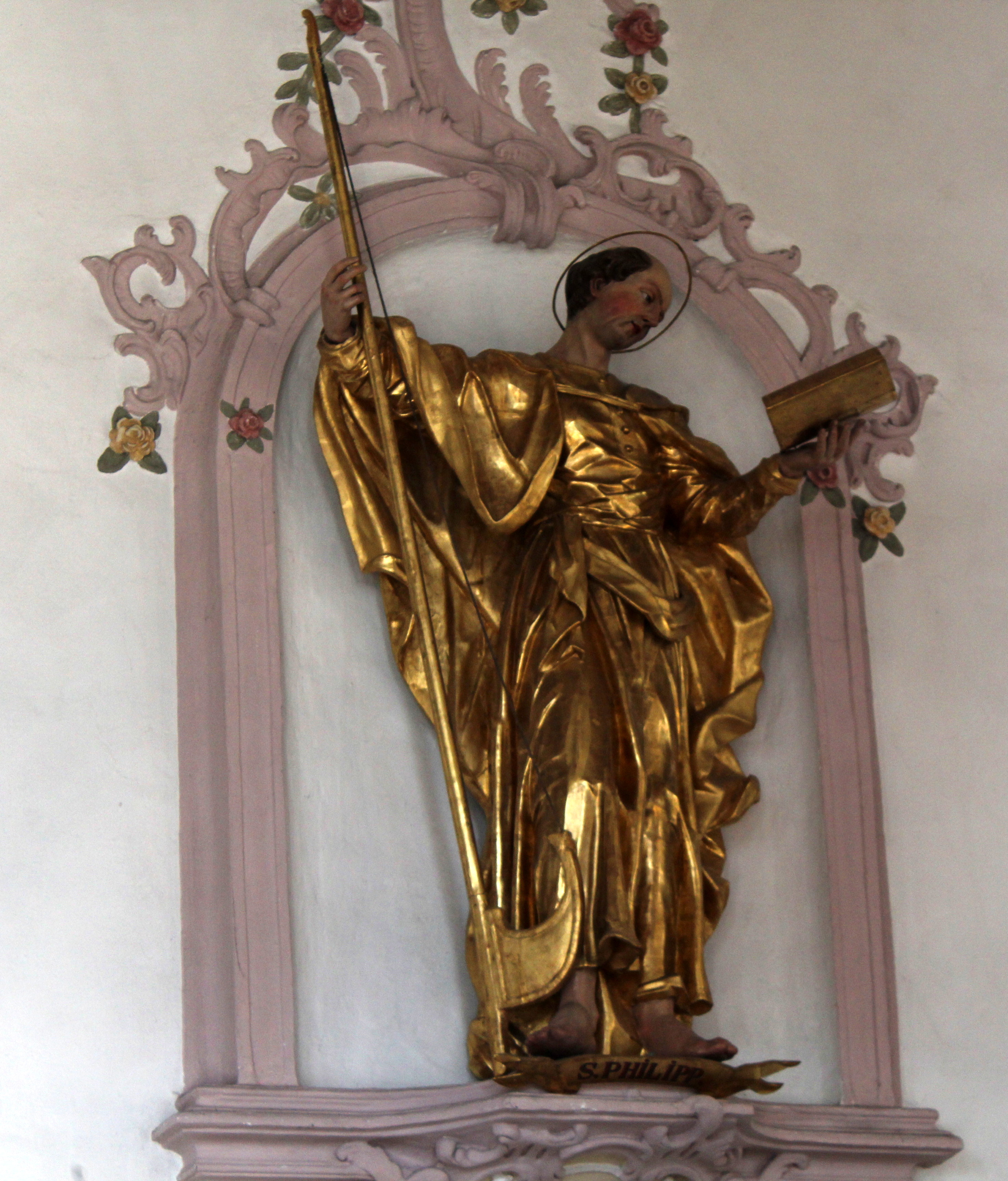 Tritt man in den Kirchenraum von Sankt Blasius, so ist man umgeben von vierzehn überlebensgroßen Rokokodarstellungen. Es sind Jesus, Maria und die zwölf Apostel. Sie tragen reich bewegte und gefaltete goldglänzende Gewänder und stehen in kleinen Nischen des Hauptraumes und des Chors. Sie umgeben die Gläubigen und sagen gleichsam, seht her und hört.