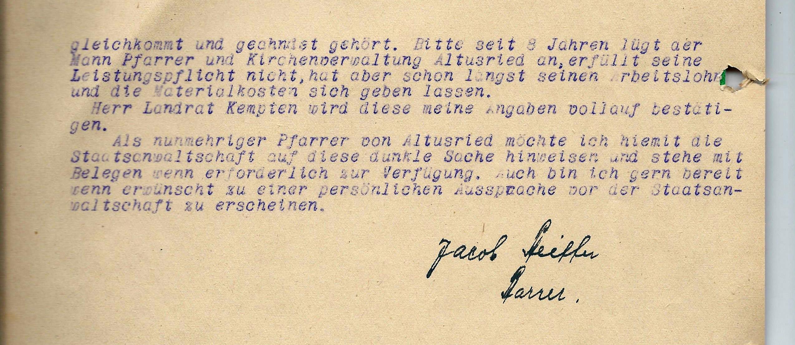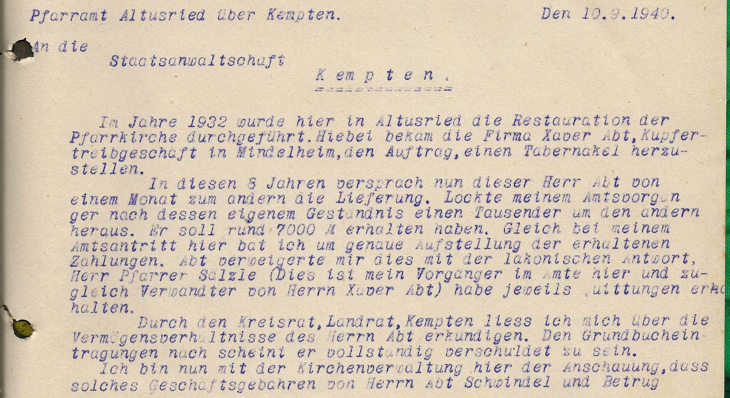 Die letzten Jahre seines Priesterlebens wurden dem Pfarrer Sälzle etwas vergällt. Vielleicht aus Gutmütigkeit hatte er seinem Vetter in Mindelheim Xaver Abt , von Beruf Kupfertreiber, eine teure Arbeit zukommen lassen. Er sollte für die Altusrieder Kirche einen neuen Tabernakel machen. Der Vetter ging auch gleich ans Werk und erhielt mehrere Vorauszahlungen in Höhe von zusammen 7000 RM. Doch das Landesamt für Denkmalpflege war mit der Neugestaltung nicht einverstanden. Die Experten stellten fest, dass der alte Tabernakel aus der Rokokozeit stammt und vom höchsten künstlerischen Wert sei, während der Neue nur eine geringe Qualität aufweise. Zudem lag für die Neuanschaffung keine Genehmigung vor. Es kam nun zu einem Rechtsstreit zwischen Pfarrer, dem Landesamt für Denkmalpflege, dem Landrat, dem Kupfertreiber Abt und der Staatsanwaltschaft. Zwischen 1932 und 1942 entstand ein dickes Bündel aus mehr als hundert Akten und Schriftstücken. Auch Sälzles Nachfolger Jacob Pfeiffer musste sich noch mit dem Rechtsstreit herumplagen.