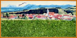 Zuerst wurden zwei Laubsägearbeiten aus Sperrholz angefertigt, einmal die Silouette des Marktes, sodann das Bergpanorama. Beide wurden dann hintereinander gestellt. Deutlich erhebt sich der Säuling im dunkleren Blau vor dem Zugspitzmassiv. Das Datum der Herstellung ist nicht vermerkt. Doch die Gebäude sind Zeitanzeiger. Die Stufenfasade des Brändlekaufhauses und der alte Pfarrhof sind noch zu sehen und das Leichenhaus ist schon neu gebaut, also müssen wir in den Fünzigerjahren sein.