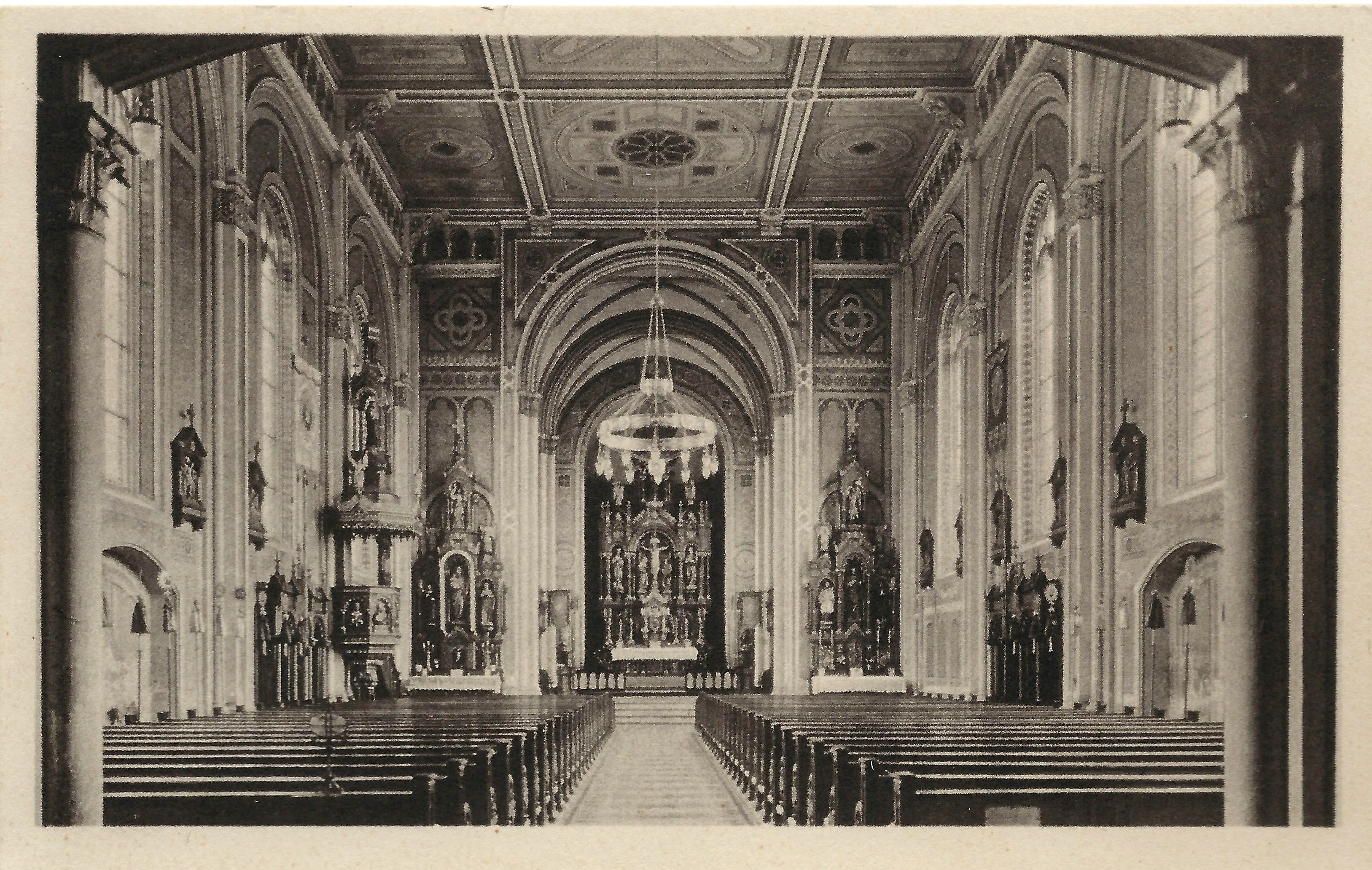 1938 wurde der Innenraum einer Renovierung unterzogen. Leider hatte der neugotische Stil nicht mehr die hohe Wertschätzung . Die reiche Farbigkeit des Innenraumes wurde stark reduziert und es entstand eine nüchterne und kühlere Art der Gotik, die aber immer noch sehr beeindruckt. Kirchenmaler Joseph Lutz aus Leutkirch hatte den Auftrag die Kirche zu renovieren. Das Ziel war durch eine neue verhaltene Farbgebung die Architektur zu betonen. Außerdem wurde die vielfarbige Schablonenmalerei an Wänden und Decke als unkirchlich empfunden und mit viel Mühe entfernt. Teile der Statuen wurden versilbert. Sogar die Gesichter und Hände überzog man silbern und golden.