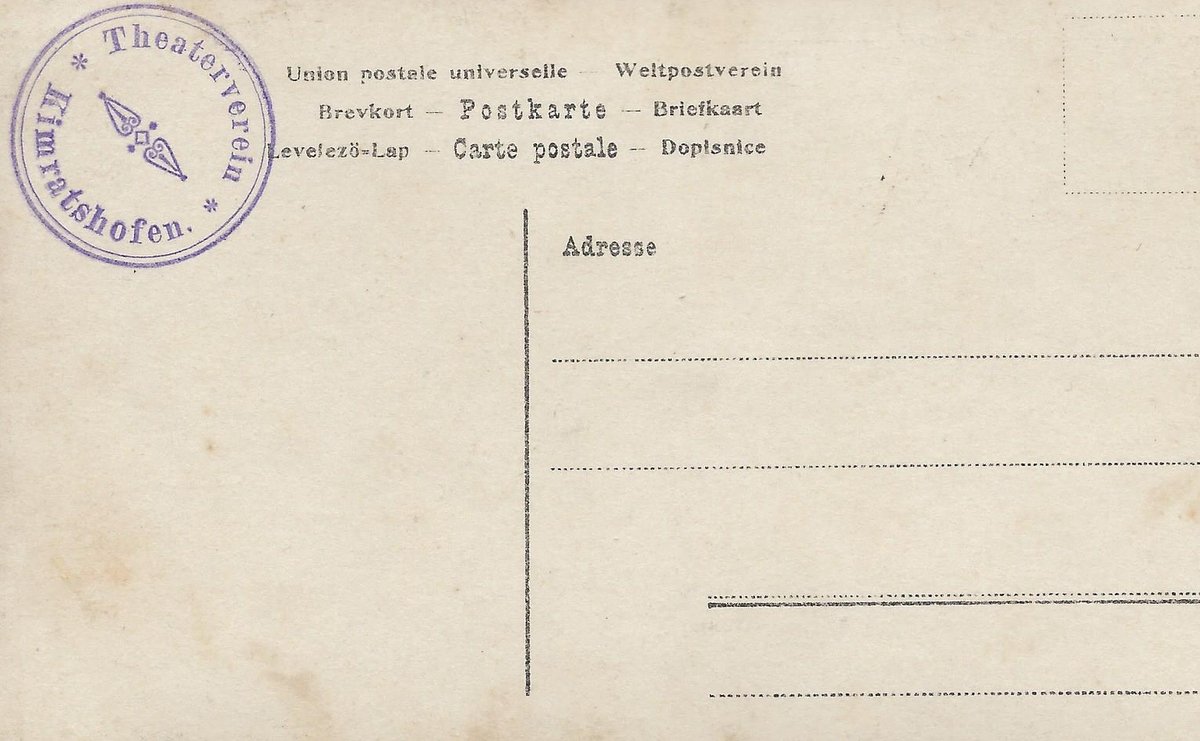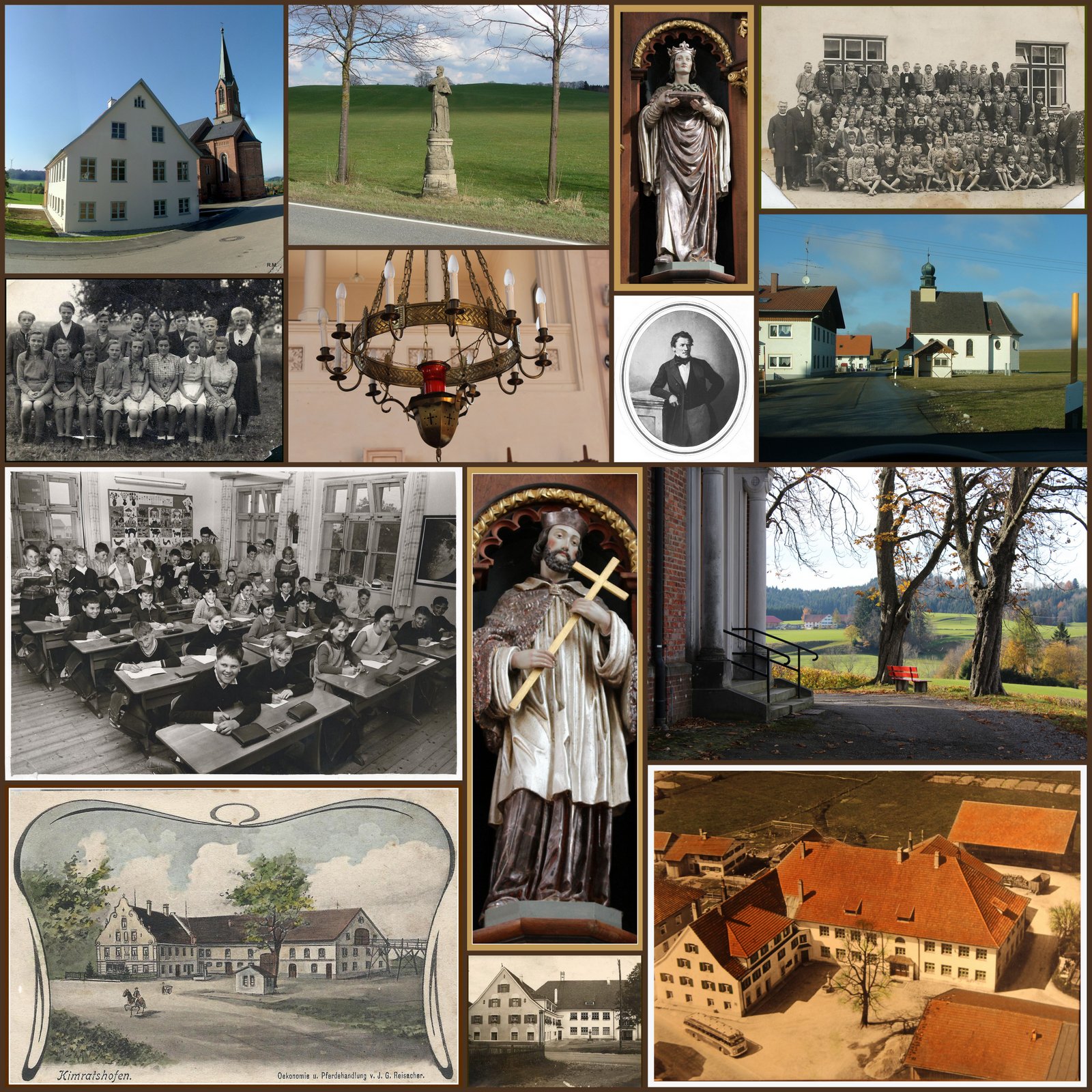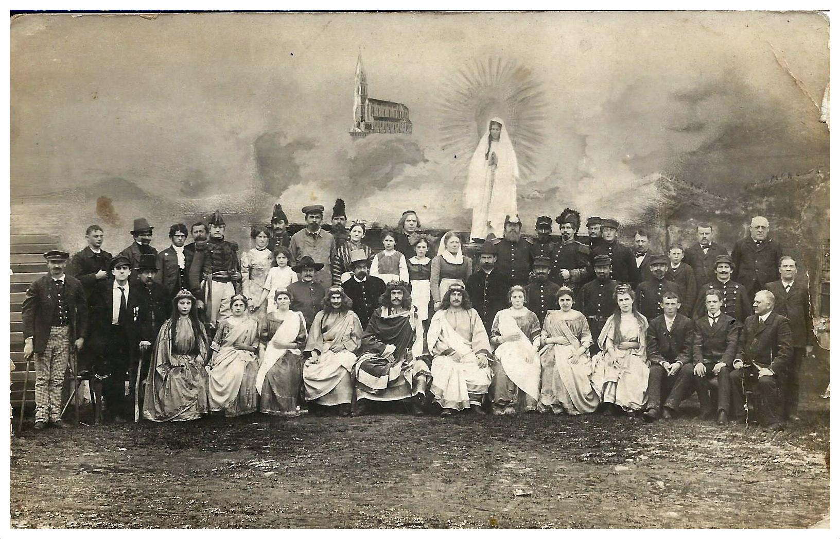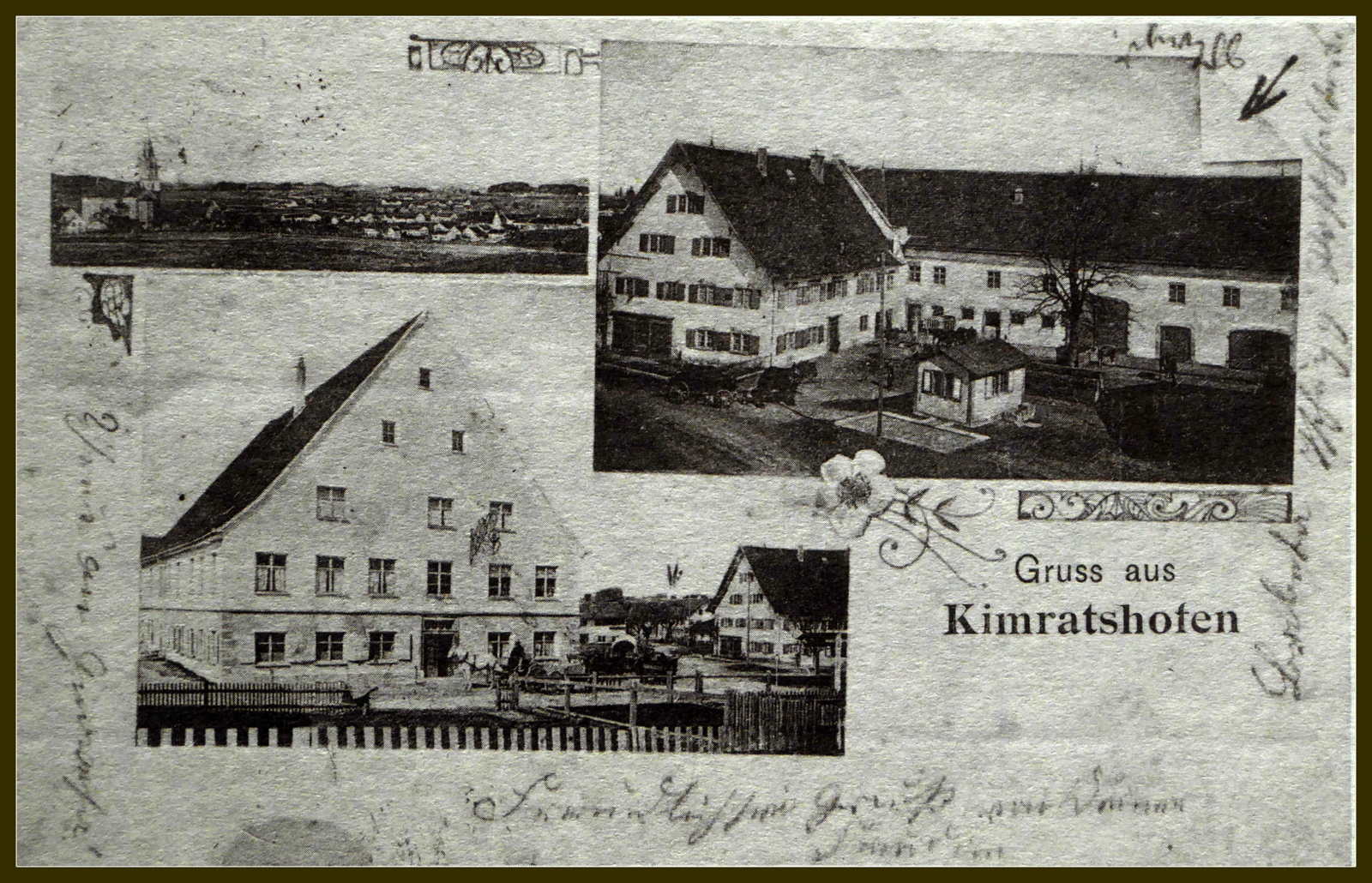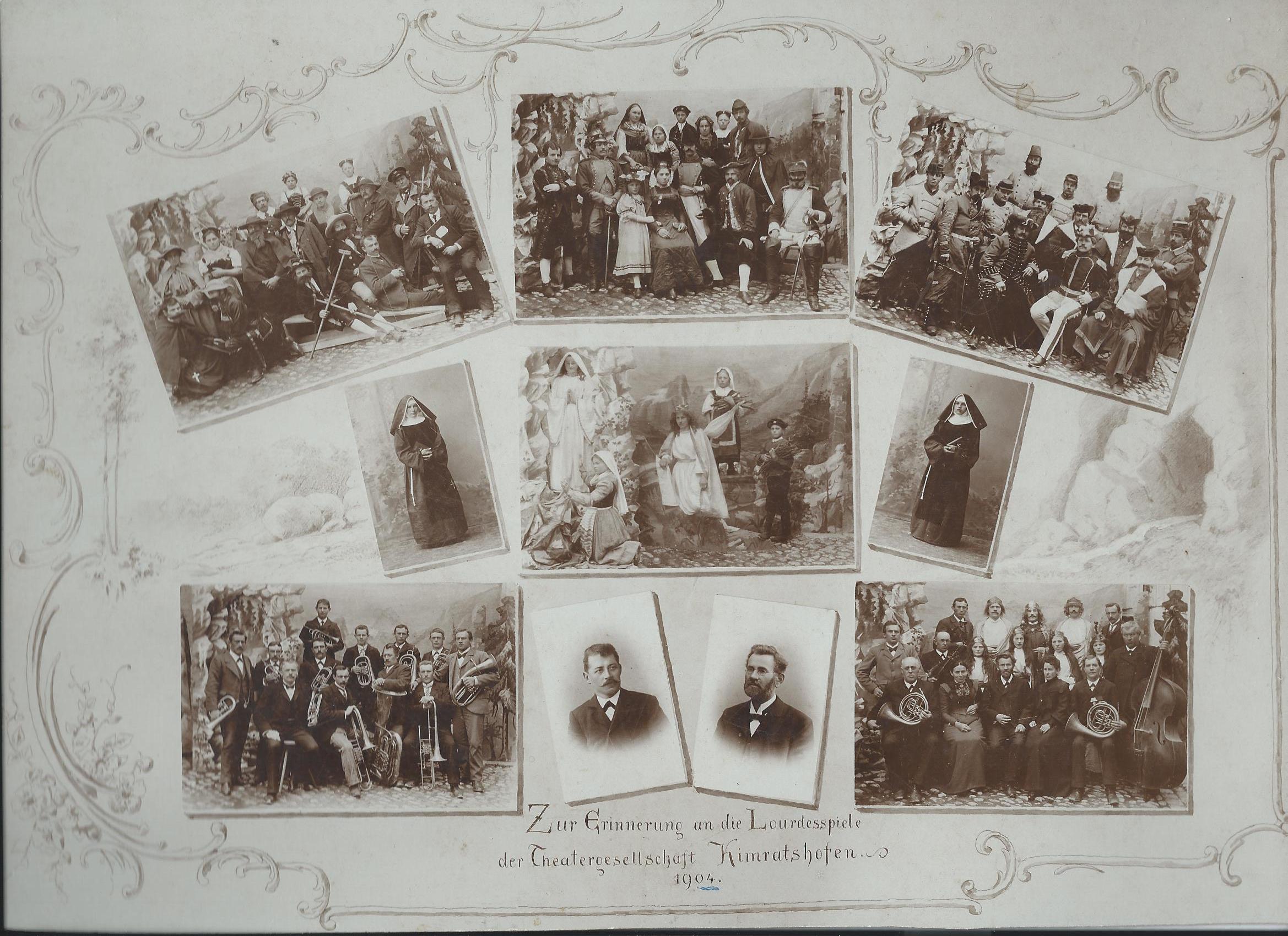 Anfang des vergangenen Jahrhunderts war die Theaterbegeisterung allgemein groß, Auch in Kimratshofen bildete sich eine Theatergesellschaft. Von den Spielen anno 1904 und 1912 im Saal der Post sind Erinnerungsfotos der Mitwirkenden erhalten geblieben. Beim Nachforschen nach den Namen der Spieler gelang es bislang nur eine Person zu identifizieren. Im zentralen Bild in der Mitte ist die Erscheinung der Maria dargestellt. Man sieht Maria und Bernadette, sodann einen Engel und zwei Hirtenkinder. Der Junge mit dem Reisigbündel ist Johann Schellhorn, geb. am 31.07.1893 , gest. am 24.01.1989 .