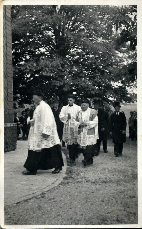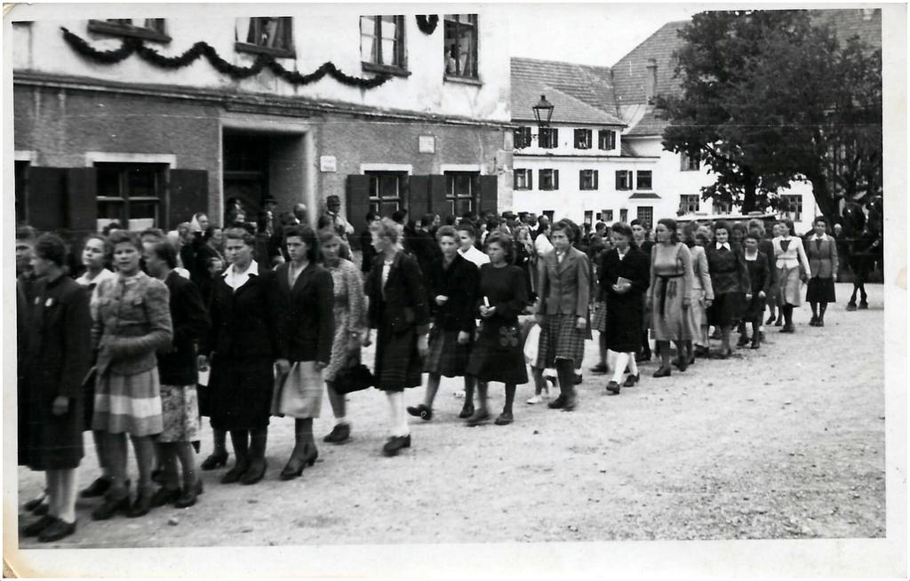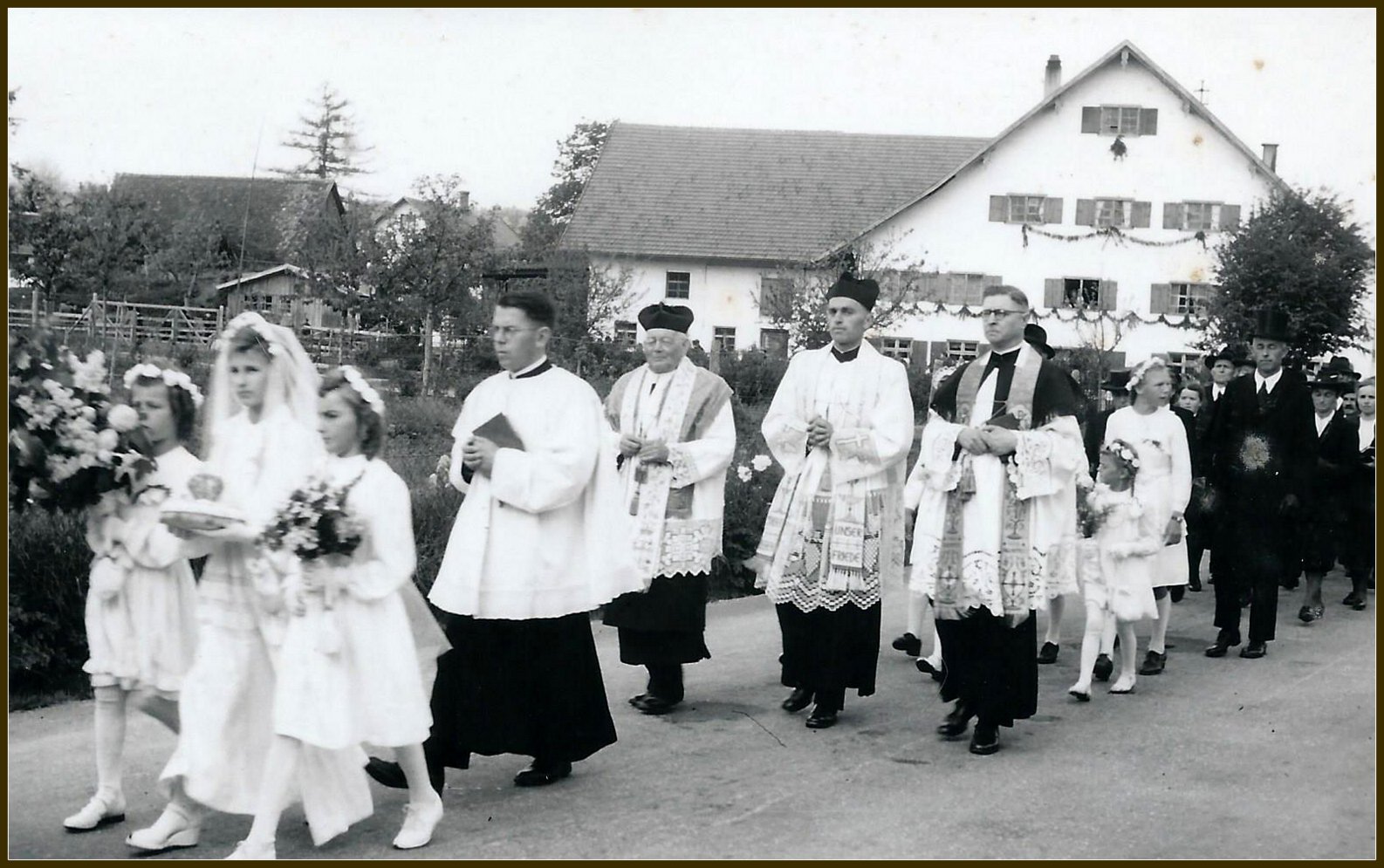 6. Der Zug führt vorbei am Endres Haus. Für Altusried war abgeordnet Gg.Burger, dahinter Pfarrer Günthör mit einem Birett als Zeichen eines Amtes.