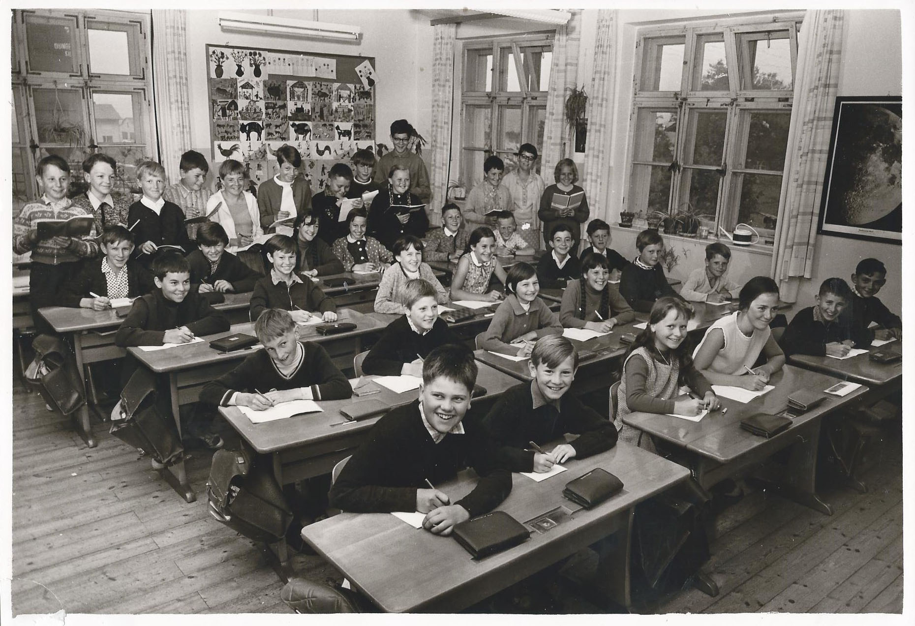 - Es ist das Jahr 1968, Wir sind im Klassenzimmer für den fünften und sechsten Jahrgang. Die Klassenlehrerin ist Rita Kösel. Jeder Schüler hat einen Schreibstift in der Hand. Die Schüler sind gut gelaunt und freuen sich über die Abwechslung, die der Fotograf in den Schulalltag bringt. Sicher hat er auch gerade eine witzige Bemerkung gemacht, denn alle Schüler lachen. Das Klassenzimmer ist gut beleuchtet. Zwei Wände haben Fenster. Es sind Doppelfenster im alten Stil. An der Pinwand hängen die Ergebnisse des Zeichenunterrichts.