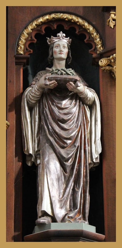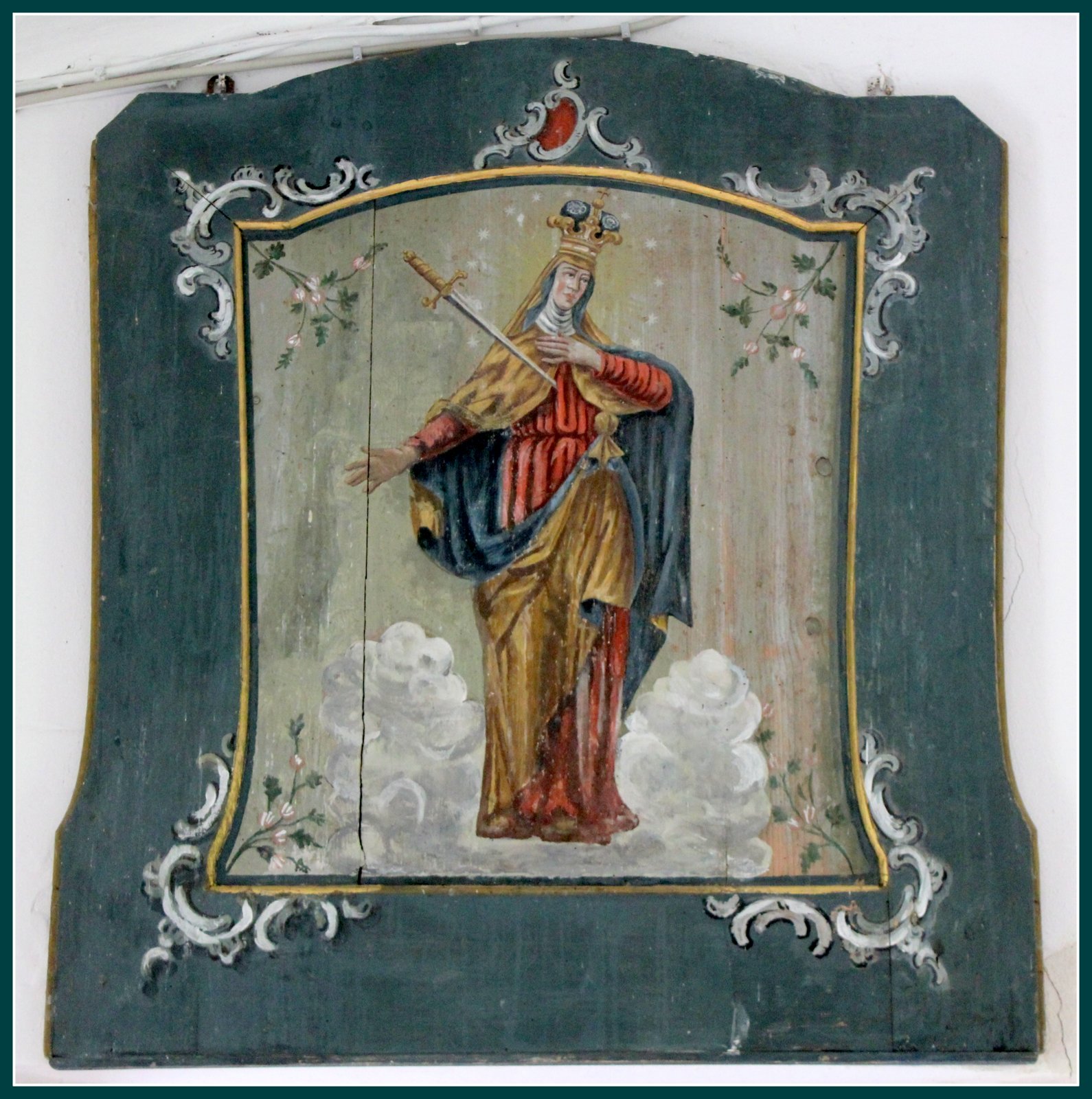 An der Zange erkennt man die Hl. Agatha, die Schutzpatronin der Kimratshofer Kirche. Sie war nach der Legende eine adelige, sizilianische Jungfrau, die schlimme Qualen erdulden musste. - Der Heilige König Ludwig IX aus Frankreich mit der Dornenkrone Christi