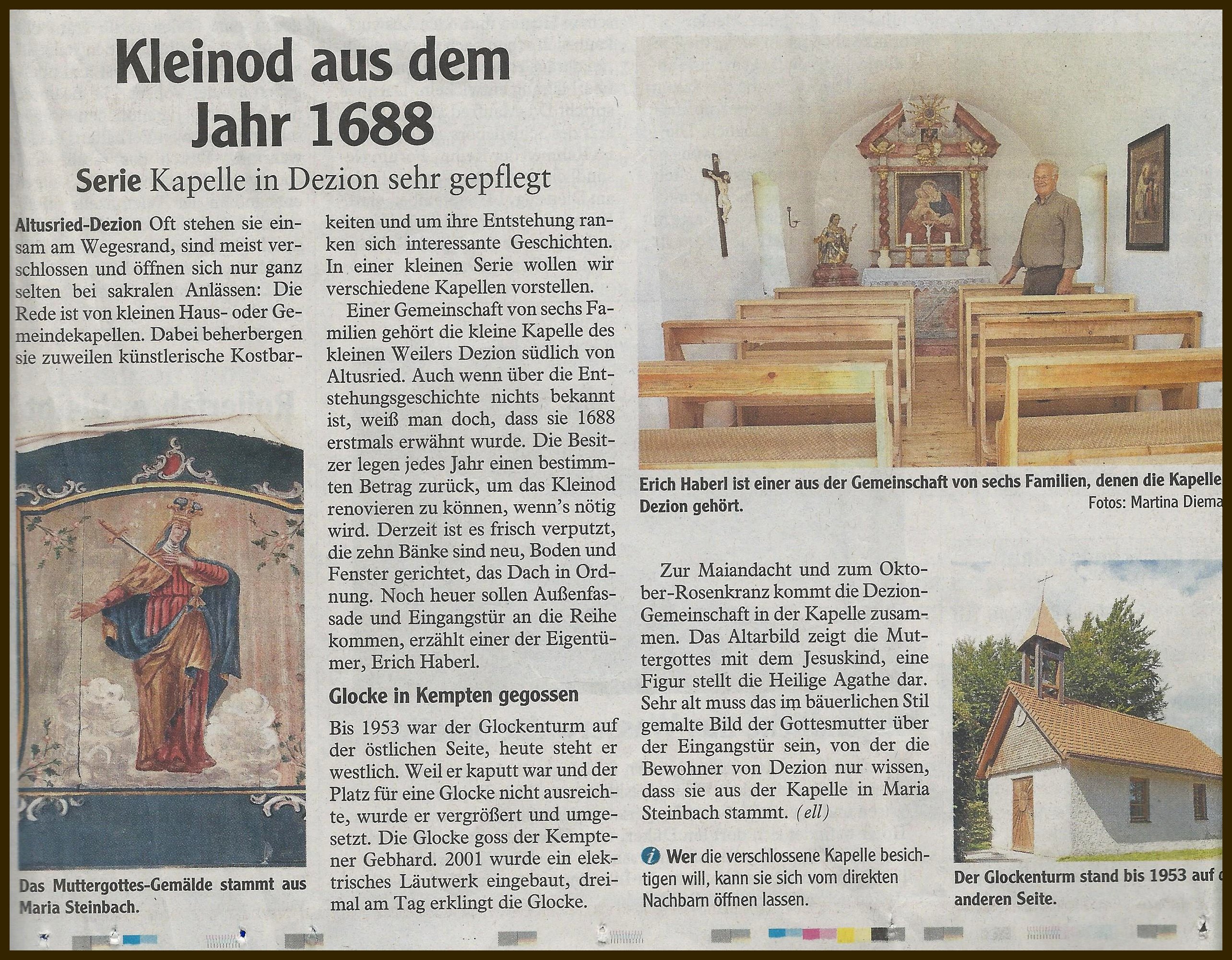 Kapelle mit Satteldach und Dachreiter, 1954 um die Hälfte verlängert. Altar aus dem 18.Jahrhundert, gedrehte Säulen flankieren das Altarbild, eine Muttergottes. Auf der Konsole unter einem Dreiecksgiebel Bild der Heiligen Ursula. Auf der Mensa Rokoko Halbfigur: St. Agatha um 1760, wohl aus der Pfarrkirche Kimratshofen. Gemälde: Steinbacher Madonna auf Holz, 18. Jahrhundert, stark erneuert.