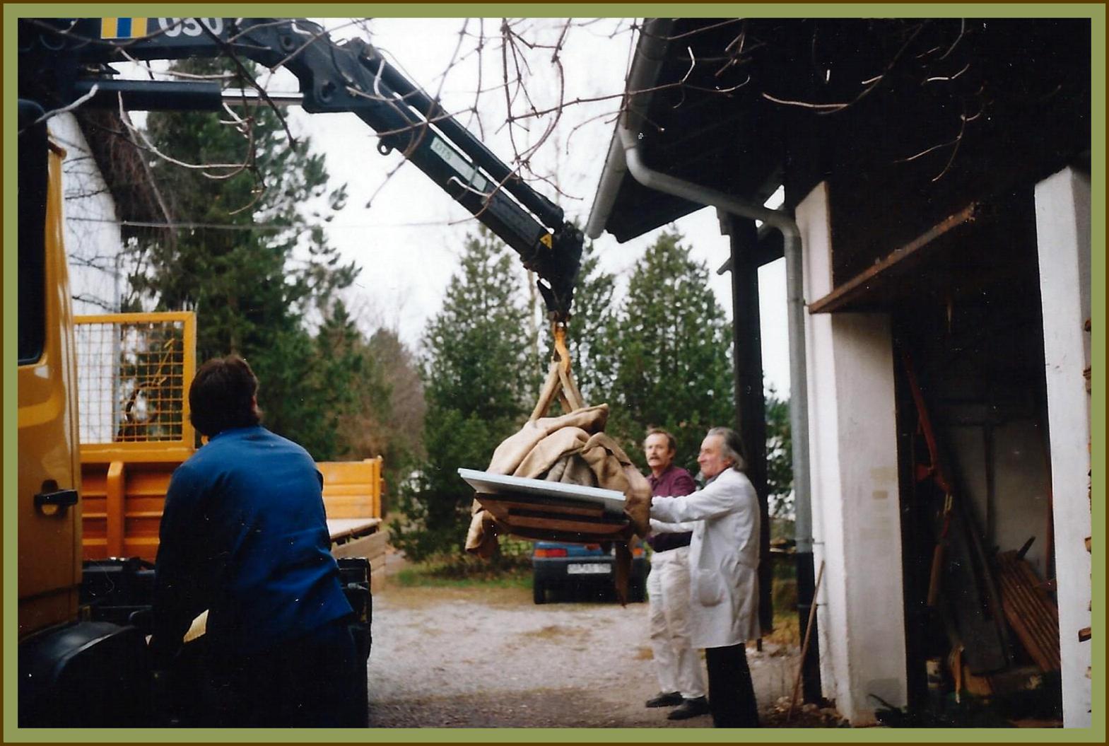 Die Statuen erhielten in der Werkstatt von Kirchenmaler Joseph Schugg die alte Farbigkeit zurück. Nach der Renovierung wurden auf Ladewagen die Figuren in die Kirche zurückgebracht. Joseph Schugg und Werner Abt vor der Werkstatt.