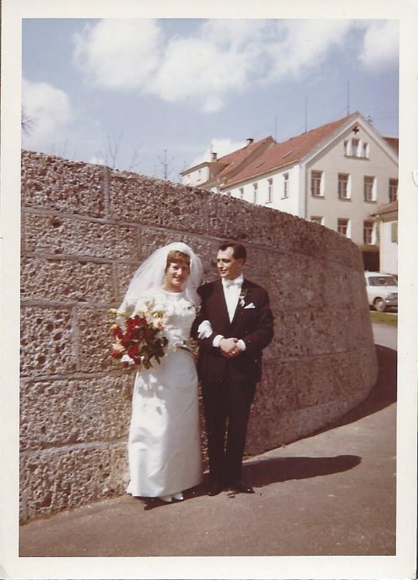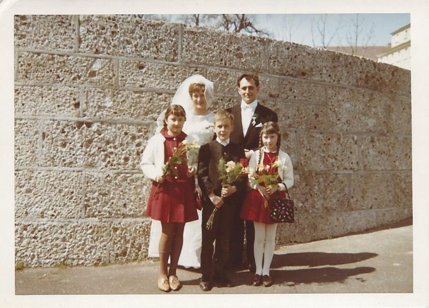 Hochzeit von Maria Bockhart und Mauersberger. Foto vor der Mauer an der Basilika in Ottobeuren. Das Lehrerehepaar unterrichtete in den Sechziger und Siebziger Jahren in Kimratshofen.
