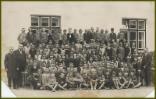 Dem Fotografen ist es gelungen fast hundert Schüler auf das Bild zu bringen. Links der Pfarrer und Hauptlehrer Probst. Im Hintergrund die Schule Kimratshofen. Die Buben sind zumeist barfuß. Viele tragen karierte Jacken.