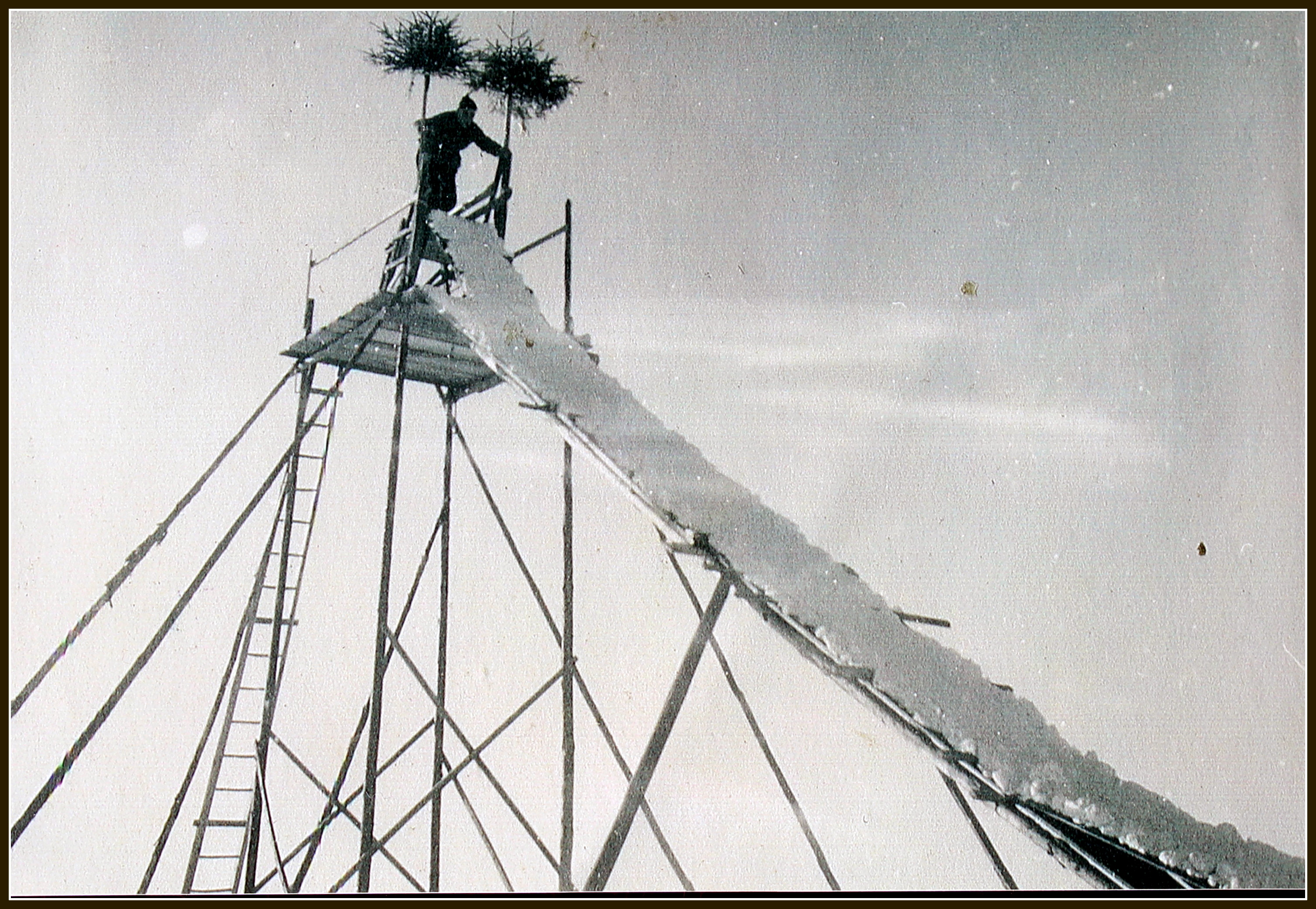 Skisprungbegeisterte Jugendliche und Männer bauten anno 1950 in Maggmannshofen eine Skischanze. Oben steht Georg Hegele. Er ist sprungbereit.