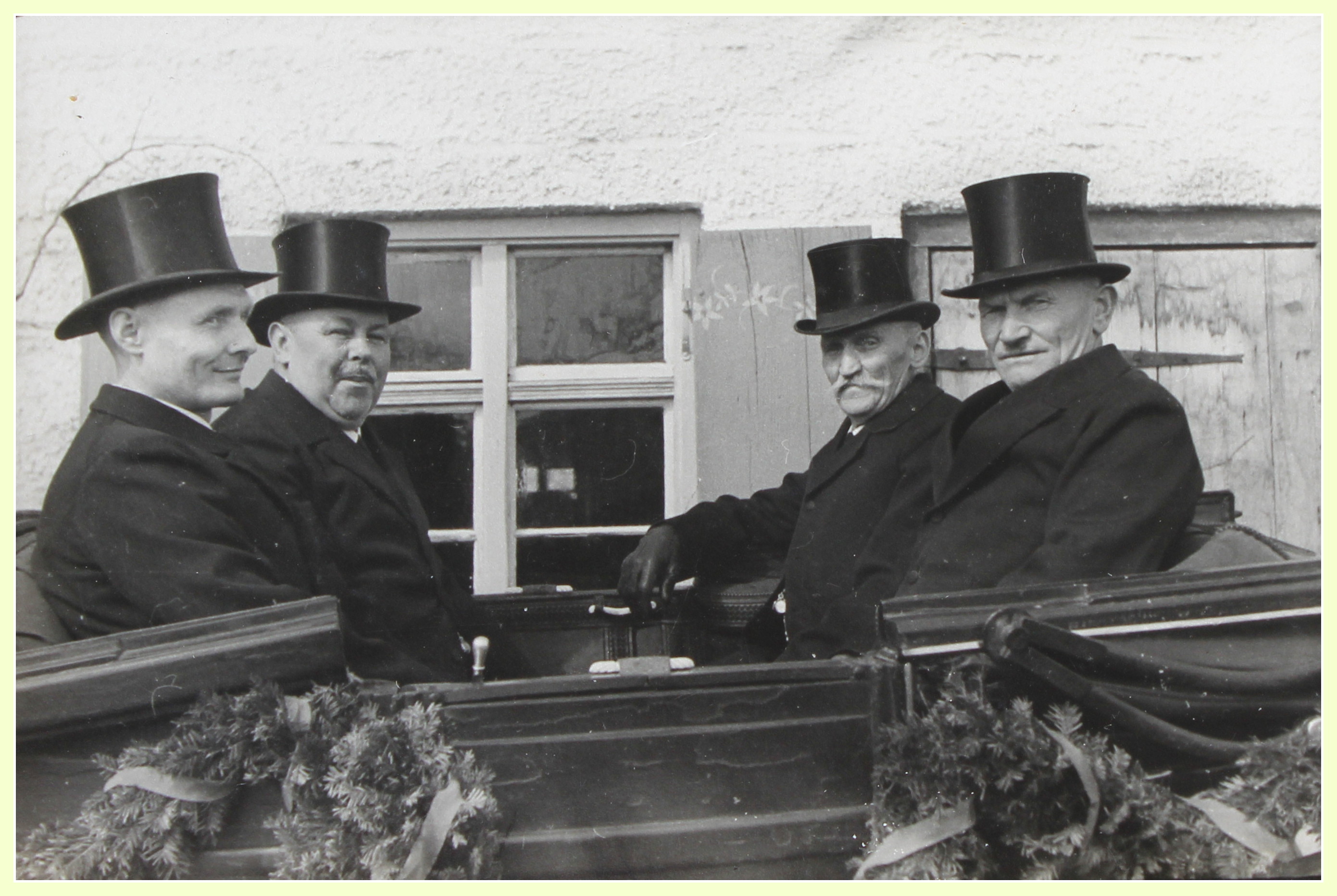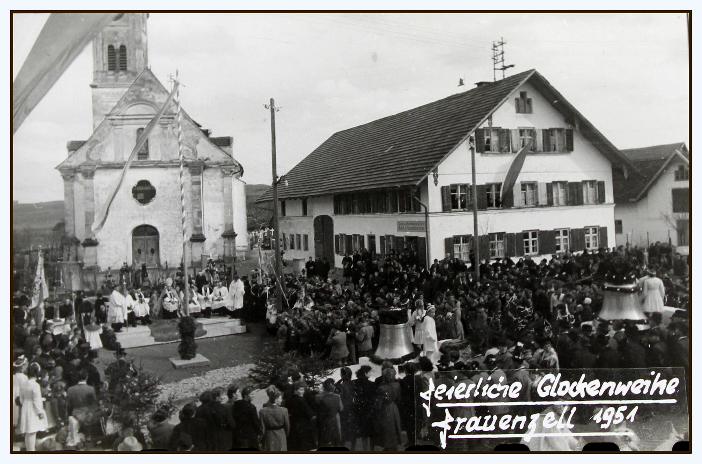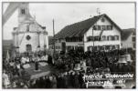 Feierliche Glockenweihe in Frauenzell an 1951. In der Kutsche sitzen die Gemeinderäte Flechtzig, Kienzelmann, Schönmetzler und Bürgermeister Völk. Auf dem mittleren Bild Abt Josef Maria Einsiedler und zweiter von links Ludwig Dorn Pfarrer und Heimatforscher.