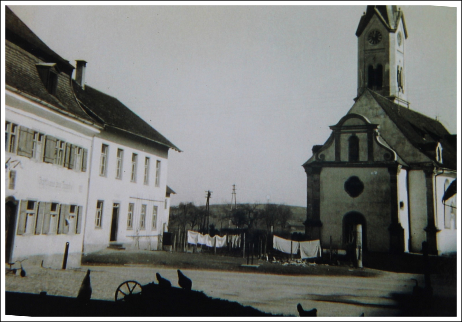 1951 Nachkriegszeit in Frauenzell. Auf dem Kirchplatz. Die Kirche ist noch nicht renoviert. Der Platz bietet sich dem Betrachter sehr ländlich dar, zwei Wäscheplätze, ein Dunghaufen und eine Hühnerschar.