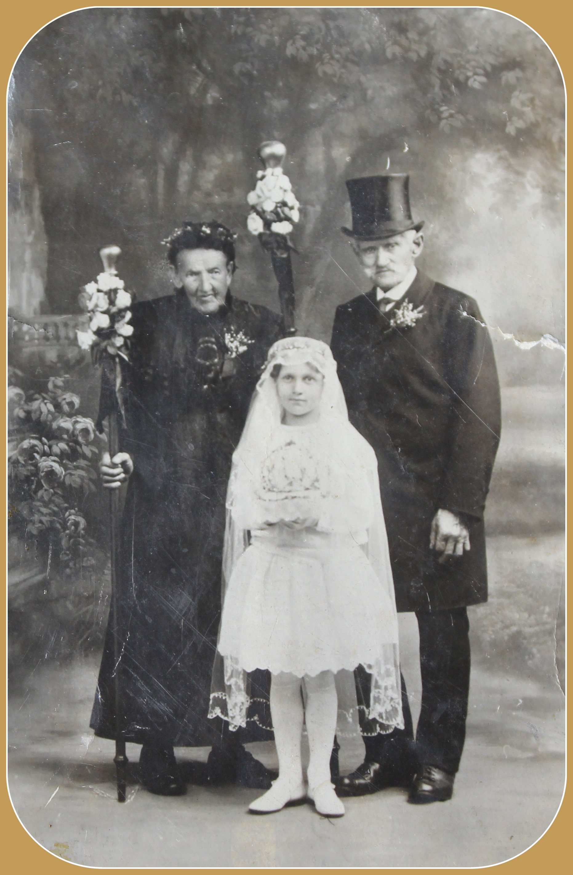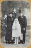1892 Goldene Hochzeit, das Jubelpaar mit der Brautjungfer, das Paar hat zwei Haselnussstecken mit Blumensträußen