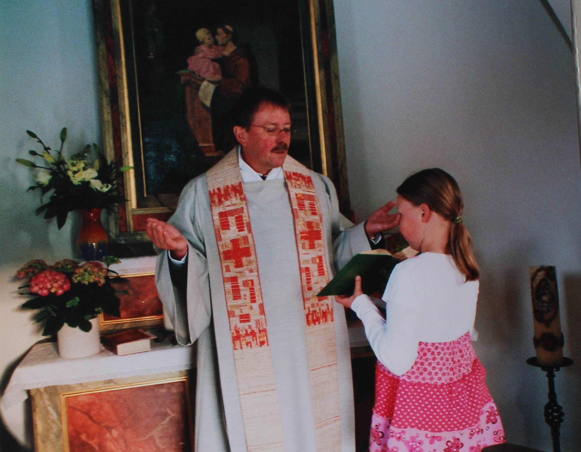 Weißer Sonntag 1957 mit Pater Drückl. Pater Drückl war Pfarrer in Frauenzell von 1956 - 1981, gestorben am 10. Februar 2003 in Calpe Spanien. Urnenbeisetzung am 27. März 2003 in Frauenzell.