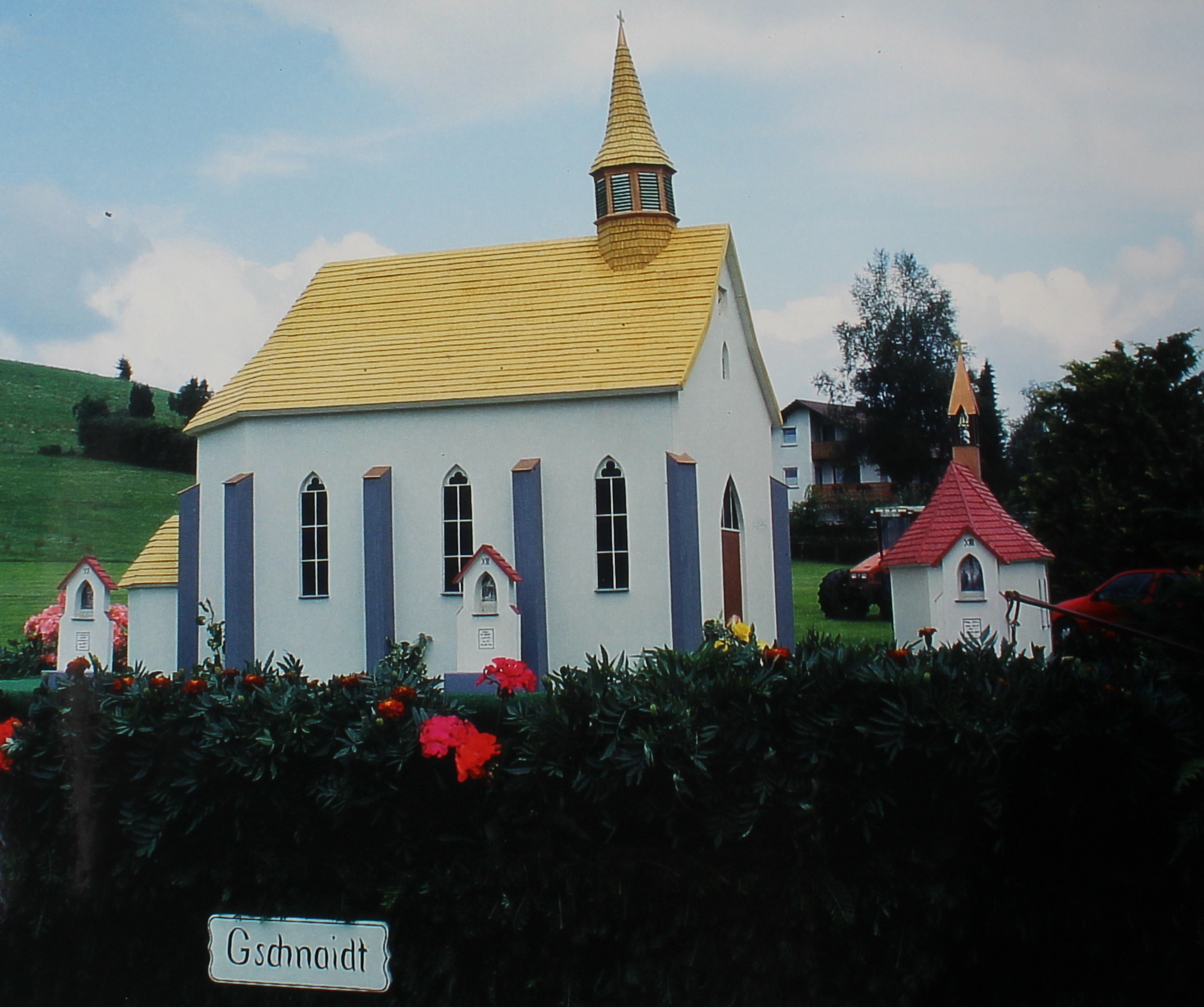 Modelle der großen und der kleinen Gschnaidt Kapelle bei einem Umzug, dazu die Stationen des Ölberges