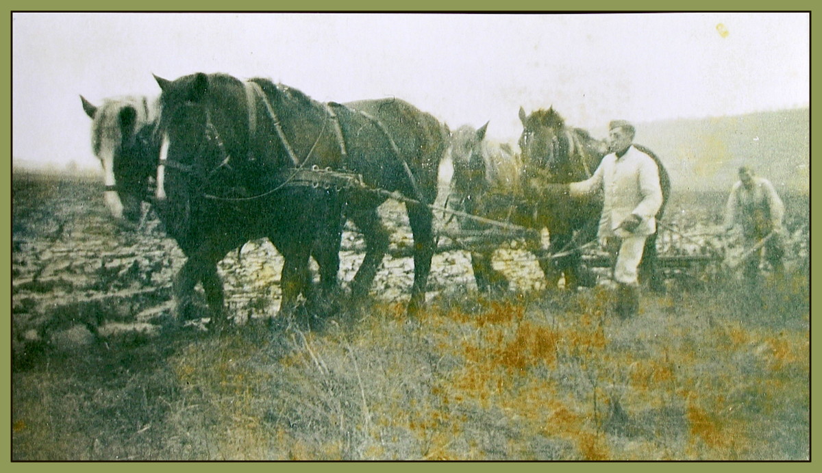 1913 Neubruch. Unter Neubruch versteht man das Umpflügen einer Wiese zu Ackerland. Für diese schwere Arbeit brauchte man vier Pferde.