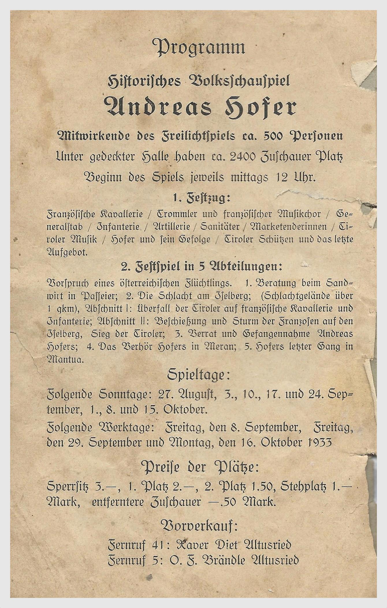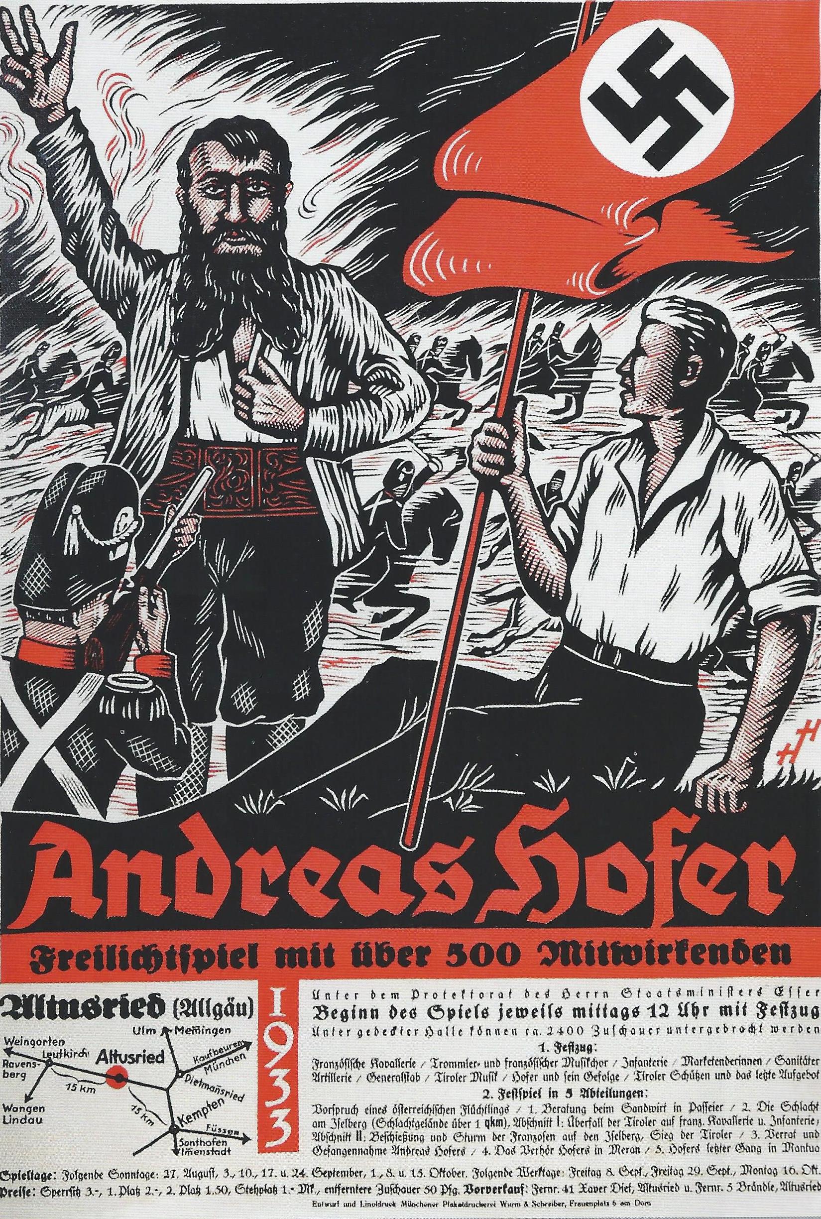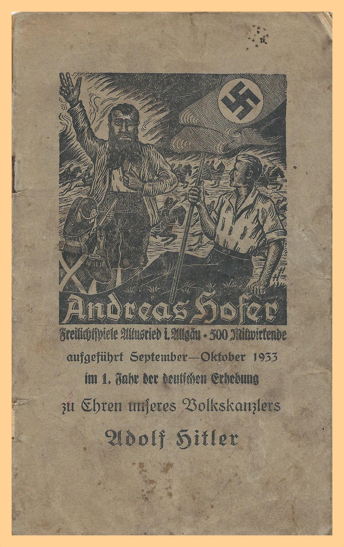 Am 30. Januar fand die Machtergreifung der NSDAP statt. Im Laufe des Jahres wurden alle Bereiche in der Politik und der Wirtschaft gleichgeschaltet. Auch die Freilichtspiele konnten sich dem nicht entziehen und wurden Teil der Propaganda. Ab dem 27. August 1933 wurde Andreas Hofer unter dem Protektorat von Staatsminister Esser gespielt. Das Spiel fand in der Höll statt. Auf dem Plakat wird vermerkt, dass das Schlachtgelände 1 qkm misst. Der beste Platz kostete 3,00 RM, entferntere 50 Pf .