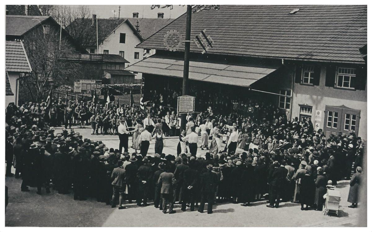 Der deutsche Gruß war ein sichtbares aber oft doch erzwungenes Bekenntnis zur Politik der Nationalsozialistischen Deutschen Arbeiter Partei. Aufnahme in den Höllwiesen.