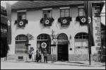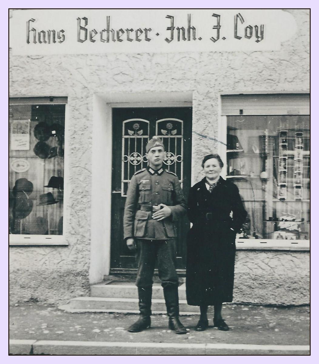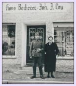 Mutter und Sohn vor dem Geschäft Hans Becherer