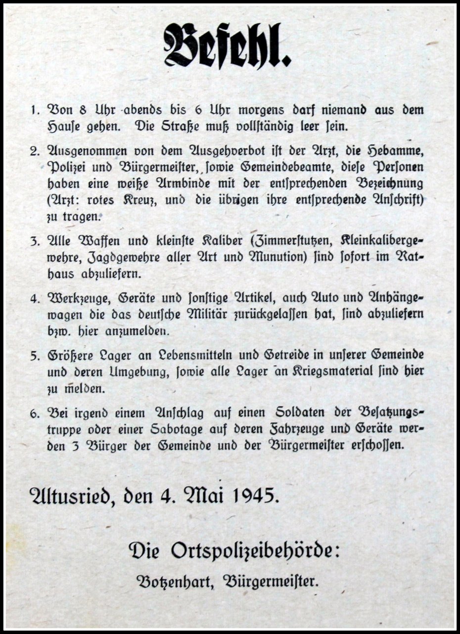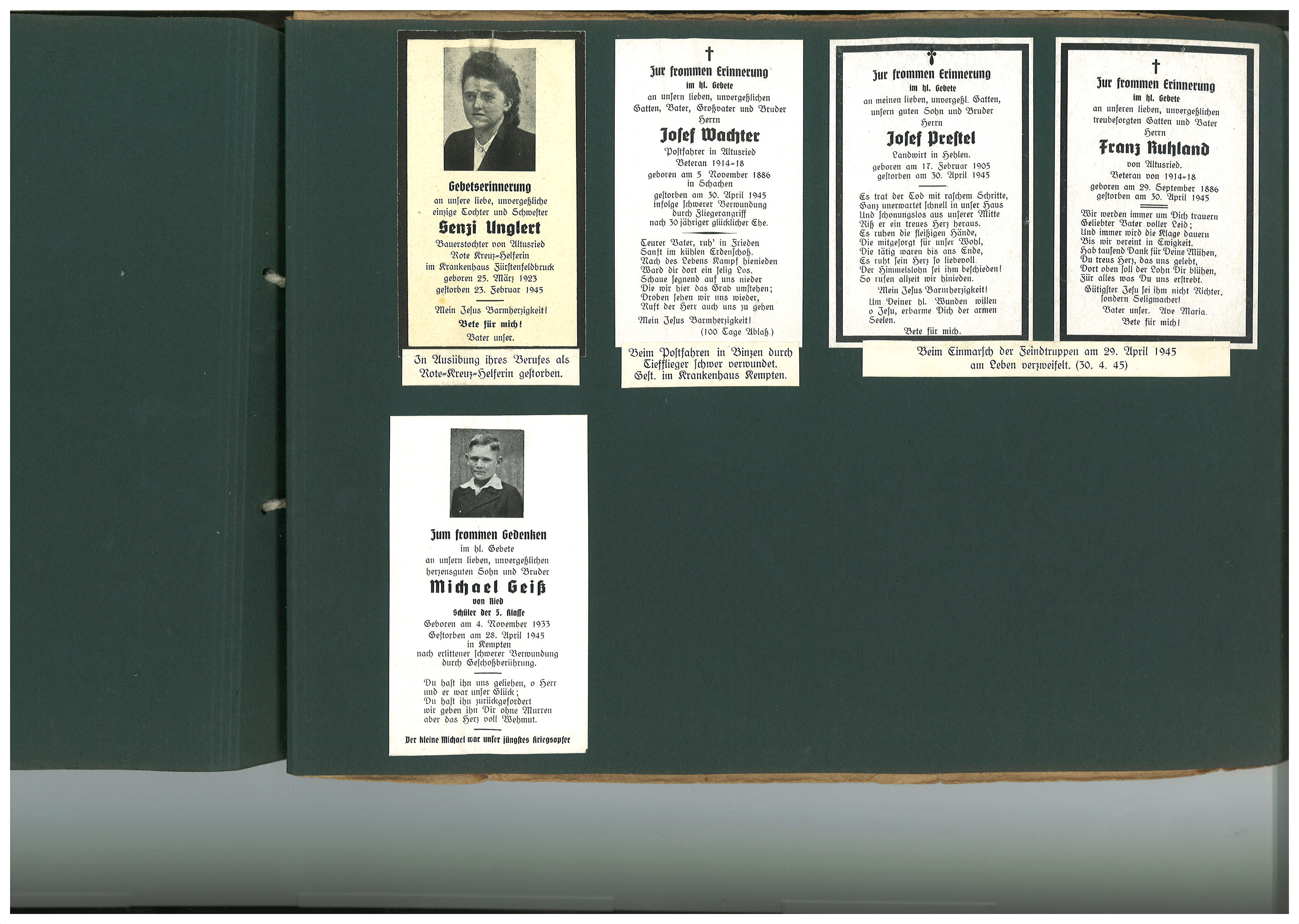 Auch in der Heimat gab es Tote, vor allem zum Ende des Krieges. In Ausübung ihres Berufes verstarb am 23.02.1945 eine Rot-Kreuz Helferin, beim Postfahren wurde in Binzen ein Postfahrer durch feindliche Flieger am 29. 04.1945 tödlich verwundet, zwei Bürger verzweifelten bei Kriegsende am Leben, ein zwölfjähriger Junge verunglückte am 28.04.1945 nach Geschoßberührung und ein Altusrieder verstarb am 20.o4.1945 bei einem Fliegerangriff in Kressborn.