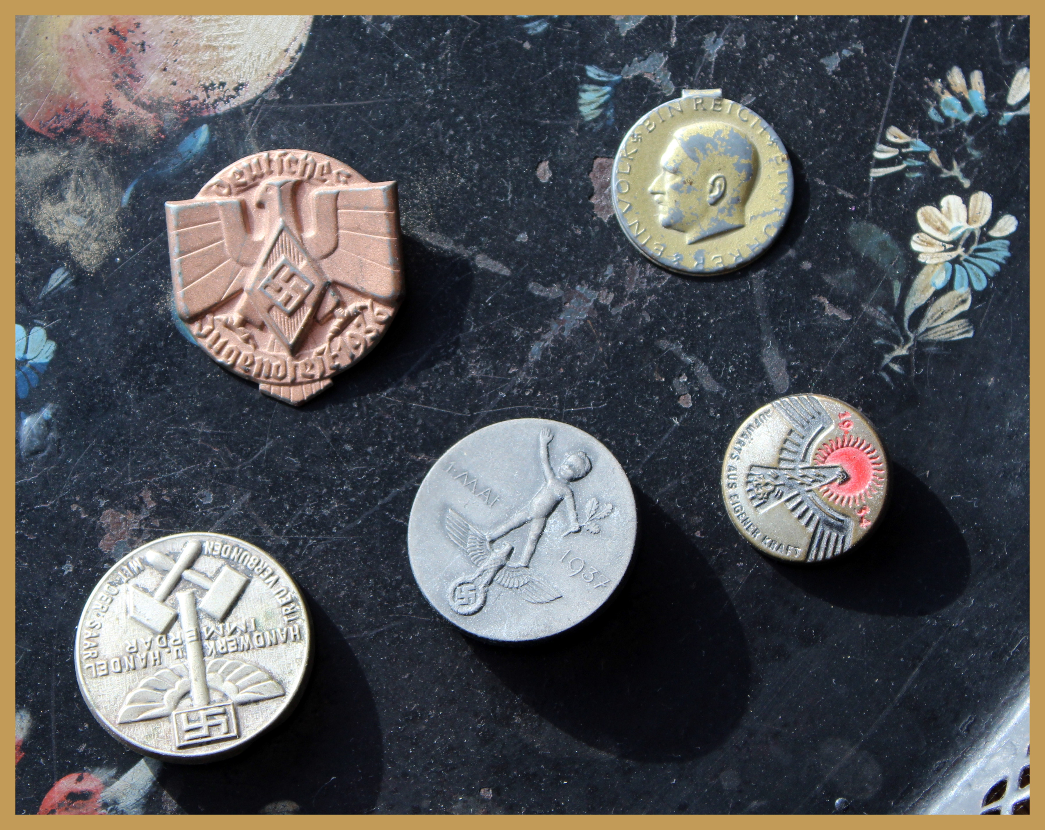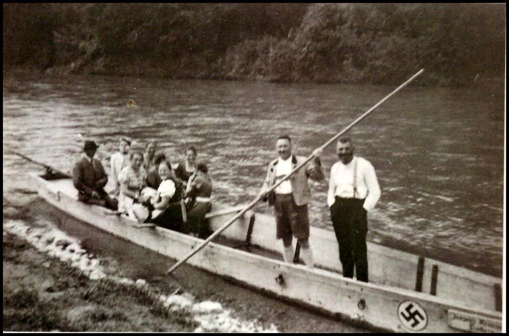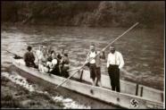 Viele Dinge des täglichen Lebens wurden mit dem Hitlerzeichen markiert, so auch die Fähre. Eine Ausflugsgesellschaft setzt über. Auch bei Festen und Ereignissen hatte man mit Anstecknadeln seine Gesinnung zu offenbaren.