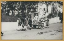 Jungfern begleiten Germania im Streitwagen und Knappen führen das Pferd. Auch die Häuser sind beflaggt.