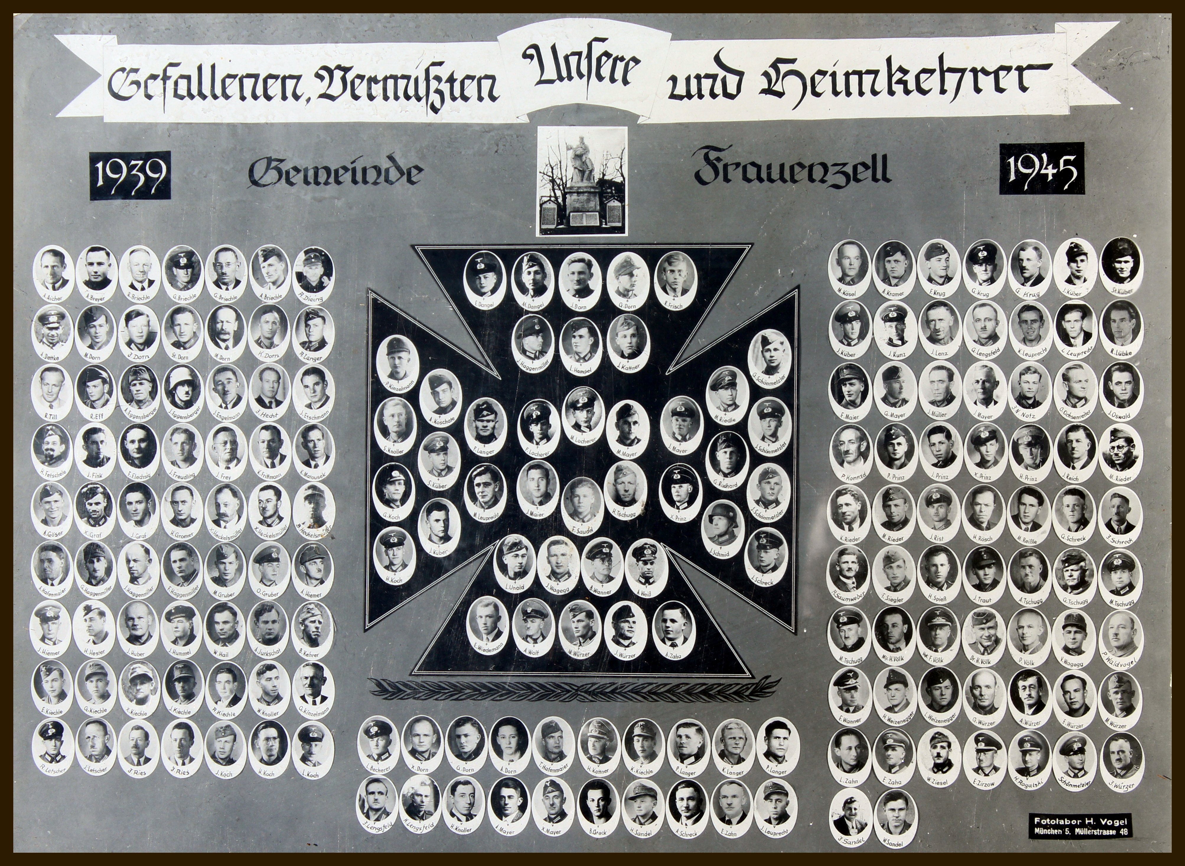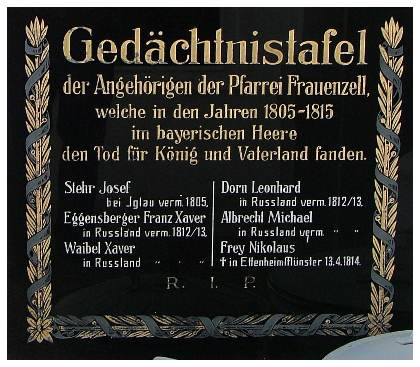 1. Gedächtnistafel der Angehörigen der Pfarrei Frauenzell, welche in den Jahren 1805 - 1815 im bayerischen Heere den Tod für König und Vaterland fanden