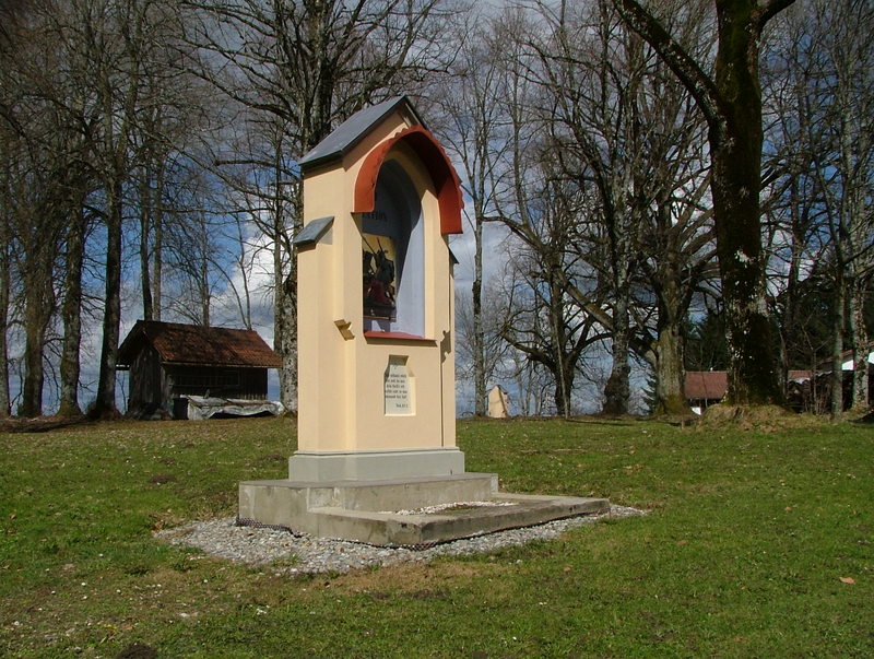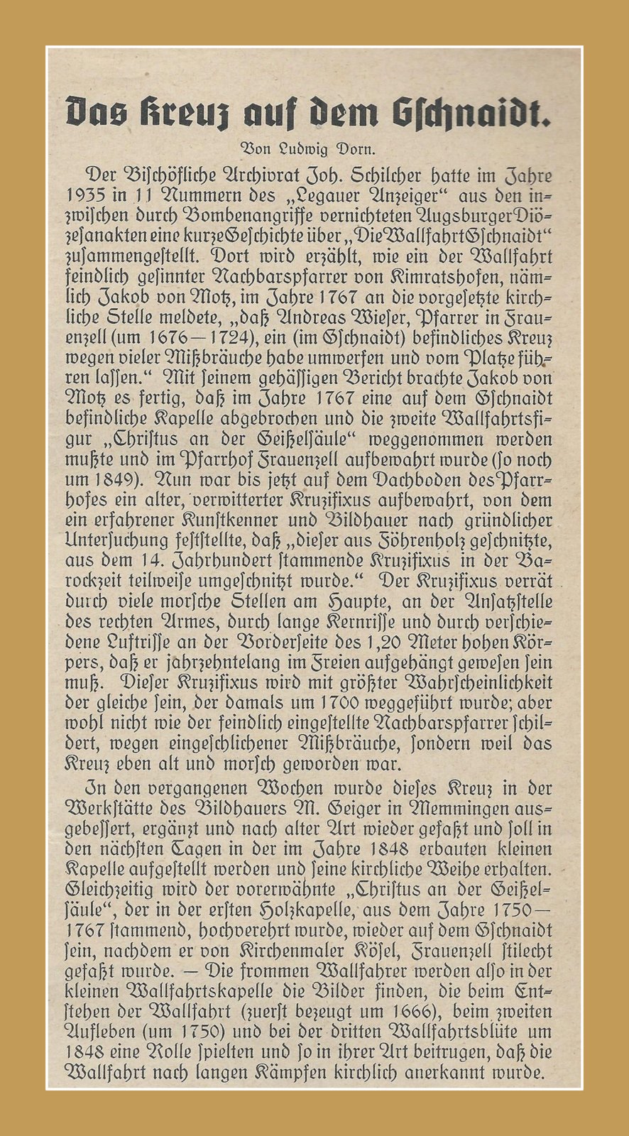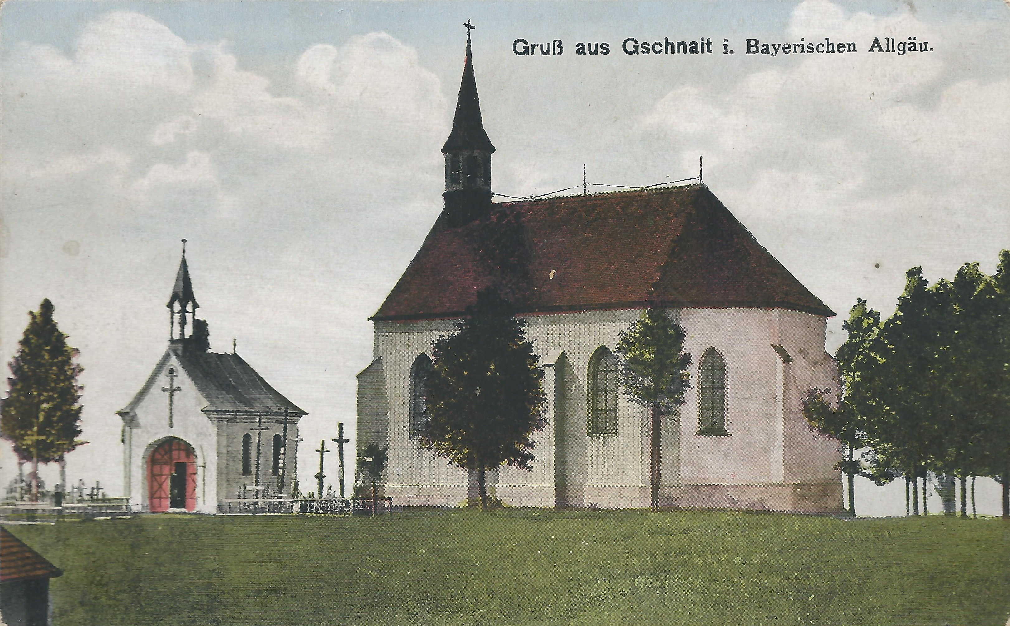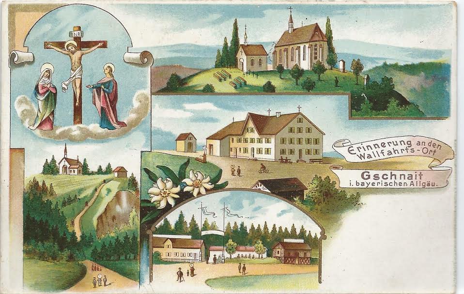 Die Postkarten von 1900 und 1908 erinnern daran, dass das Gschnaidt mit seinen Kapellen einerseits ein bekannter Wallfahrtsort war, andererseits dem Wallfahrer mit dem Gasthaus Zum Kreuz mit angeschlossener Metzgerei, Gartenlokal und Kegelbahn aber auch die entsprechende leibliche Versorgung bieten konnte. Die heutige Wirtsfamilie Baur ist seit 1905 auf dem Gschnaidt ansässig. Die Quelle mit dem heilkräftigen Wasser ist der Ausgangspunkt des Kreuzweges mit den stattlichen Bildstöcken. Text von Paul Prinz.
