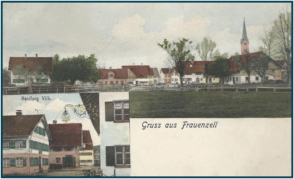 Beide Postkarten machen Werbung für die Handlung von Philipp Völk. Die erste Karte zeigt Frauenzell aus der Vogelschau, im Hintergrund der Vogelberg. Die Karte muss sehr alt sein, denn das Auto vor der Handlung Völk ist ein sehr altes Modell. Die zweite Karte zeigt als eingeschobenes Foto das Dreierensemble der heutigen Häuser Schwalbenweg 2 (Bäckerei Weber), Dorfstraße 18 (Wohnhaus Koch) und Dorfstraße 16 (ehemaliger unterer Wirt "Gasthaus Zur Traube") ; in das Bild hinein ragt das Wirtshausschild vom oberen Wirt "Gasthaus "Zum Löwen".