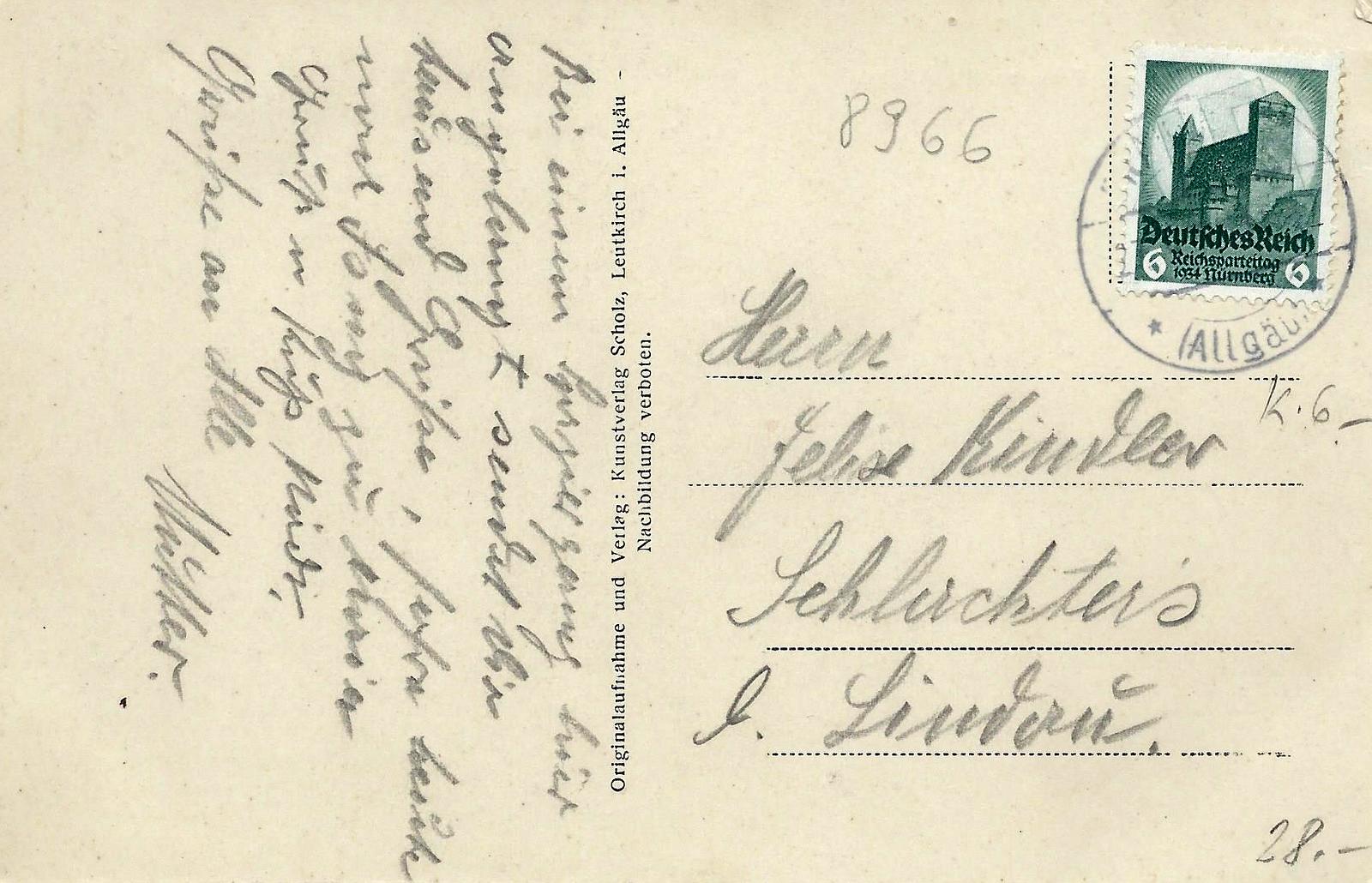Offensichtlich gab es 1934 Pläne Frauenzell zu einem Luftkurort zu entwickeln. Auf der Rückseite eine 6 Pf Briefmarke, sie macht Reklame für den Reichsparteitag in Nürnberg. Auch die Post war Teil der nationalsozialistischen Propaganda.