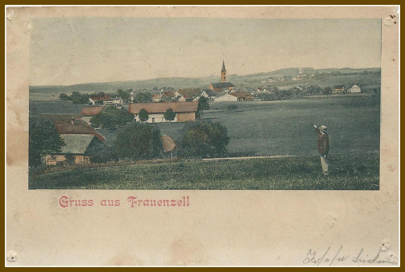 Die Karte wurde am 15. Februar 1901 nach Engelbolzhofen bei Leutkirch geschickt. Rechts im Vordergrund steht ein Mann mit hellem Hut, der mit erhobener Hand auf Frauenzell zeigt. Die Postkarte ist doppelt, einmal gelaufen, einmal ungebraucht,