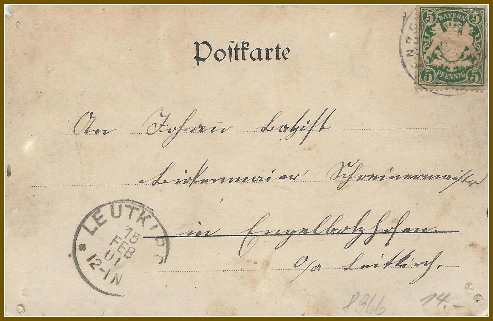 Die Karte geht am 15. August 1905 an den wohlgeborenen Herrn Xaver Natterer in Leubas, Station Heising. Freigemacht ist sie mit einer 5 Pf Bayern Briefmarke mit königlichem Wappen. Auf der Bildseite ist ein Gedicht vermerkt. Die erste Zeile heißt: "Gutes Wetter ganz vorzüglich ". Das idyllische Bild zeigt einen Baum,Weidevieh, das Dorf und den Vogelsberg.