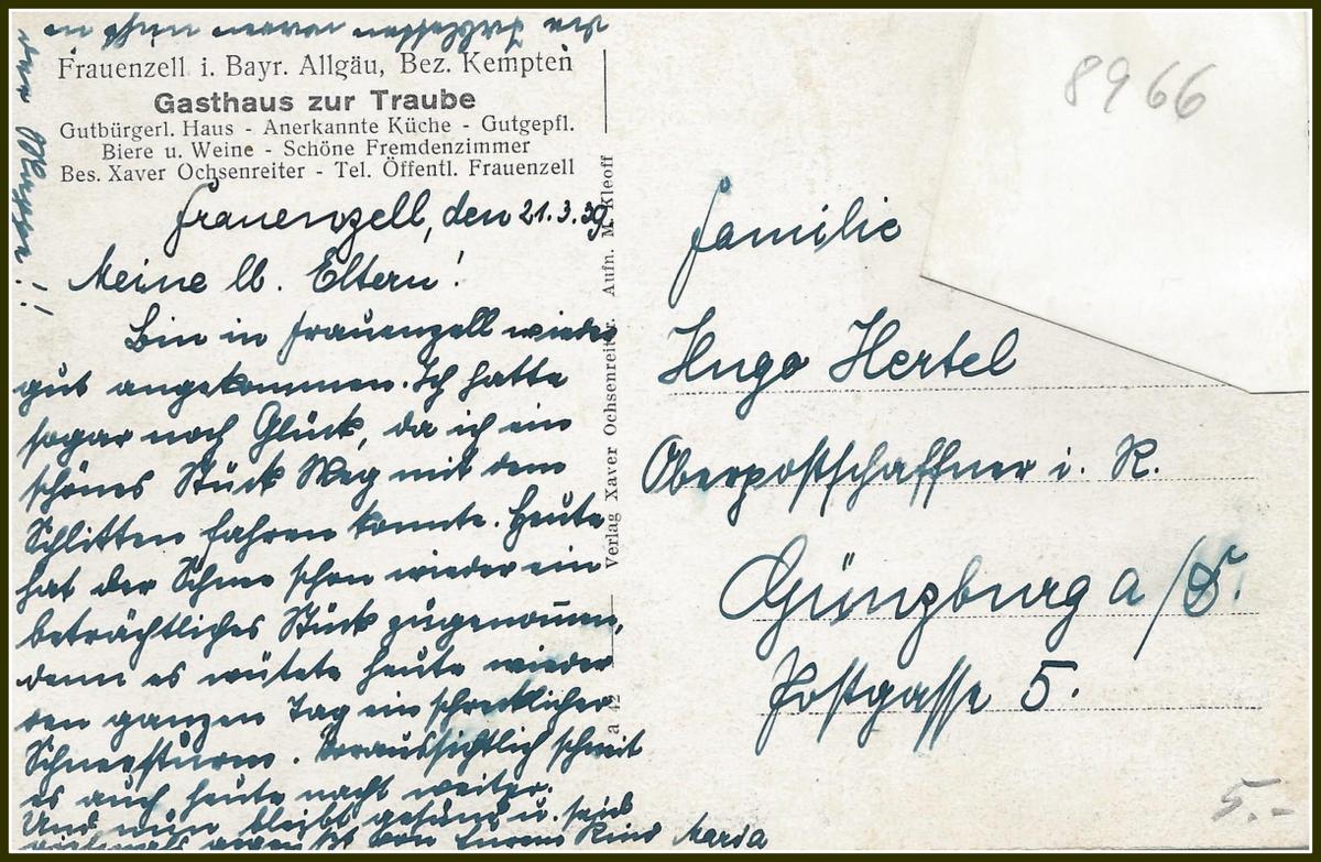 21.März 1939 Maria Hertel schrieb an ihren Vater Hugo Hertel Oberpostchaffeur i.R. in Günzburg an der Donau, Postgasse 5 . Maria war vermutlich in Stellung in Frauenzell. Bestimmt hatte sie Heimweh. Eindringlich schildert sie den späten Wintereinfall. " Meine lieben Eltern. Bin in Frauenzell wieder gut angekommen. Ich hatte sogar noch Glück, da ich ein kleines Stück Weg mit dem Schlitten fahren konnte. Heute hat der Schnee schon wieder ein beträchliches Stück zugenommen, denn es wütete heute wieder den ganzen Tag ein schrecklicher Schneesturm. Unaufhörlich schneit es auch heute weiter. "