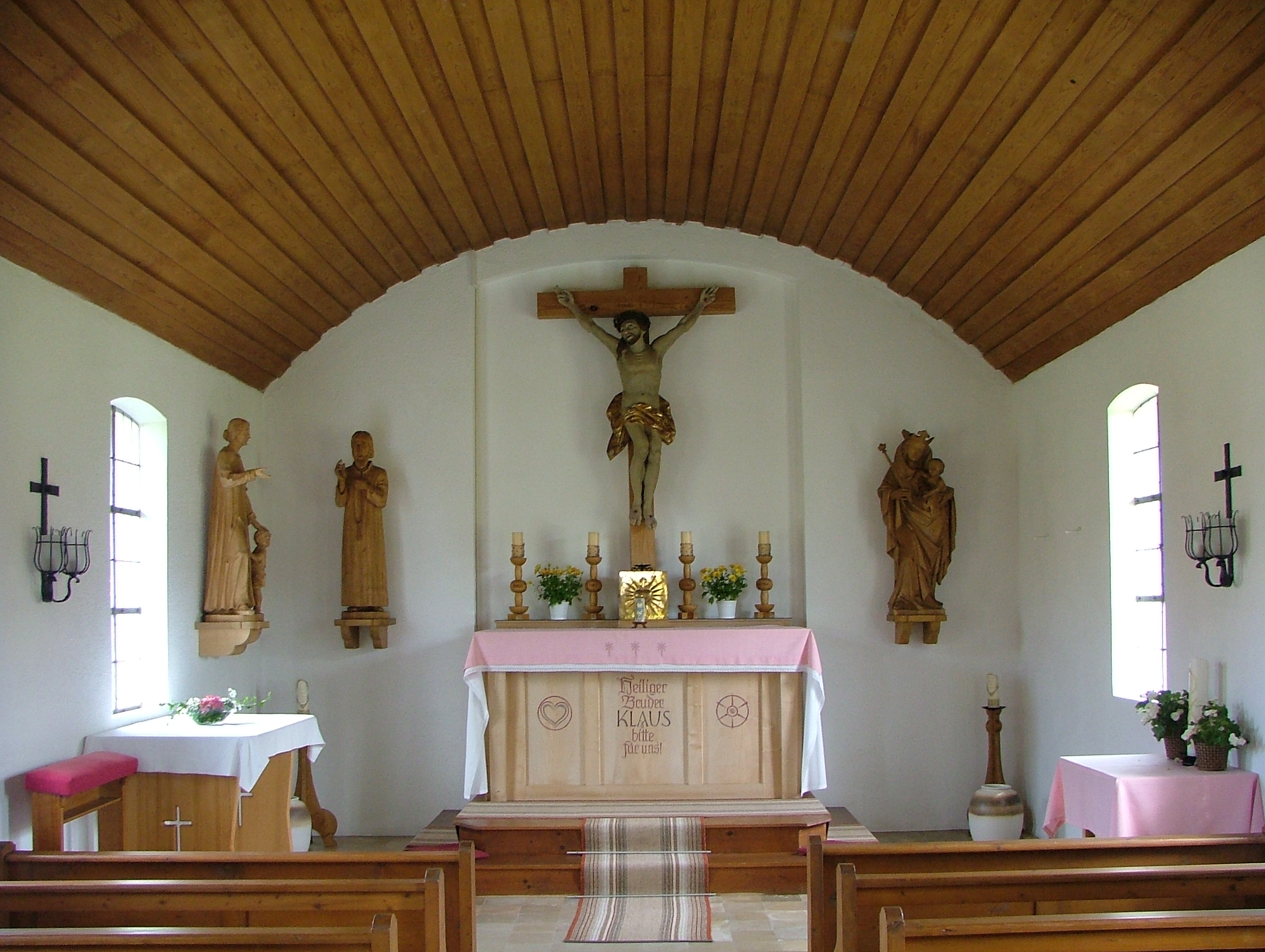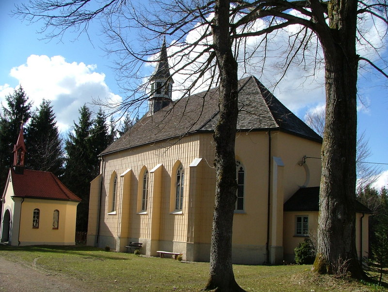 Die kleine Kapelle wurde 1750 errichtet, wurde aber 1767 schon wieder abgebrochen. 1848 wurde sie neu erstellt durch J. A. Daibler, nun aber nach Norden ausgerichtet. Eine neue größere Kapelle im neugotischen Stil wurde 1859 von dem Baumeister Martin aus Grönenbach erstellt. Es ist ein dreiseitig geschlossener Saal mit Netzgewölbe, dazu ein geräumiger Vorraum, auch der neugotische Altar ist im Stile der Erbauungszeit. Ebenso stammen die Kreuzwestationen, die hinab zur Quelle führen, aus der Zeit um 1856. Eine Reihe großer Kreuze umgibt auf dem Foto die kleine Kapelle. Es sind Wallfahrtskreuze, die Wallfahrer mitgetragen und hier aufgestellt haben. Den Brauch Kreuze aufzustellen gibt es auch heute noch, jedoch in veränderter Form. Hölzerne Sterbekreuze finden hier eine letzte Stätte. Wohl mehr als tausend Kreuze umgeben heutzutage den Ort.