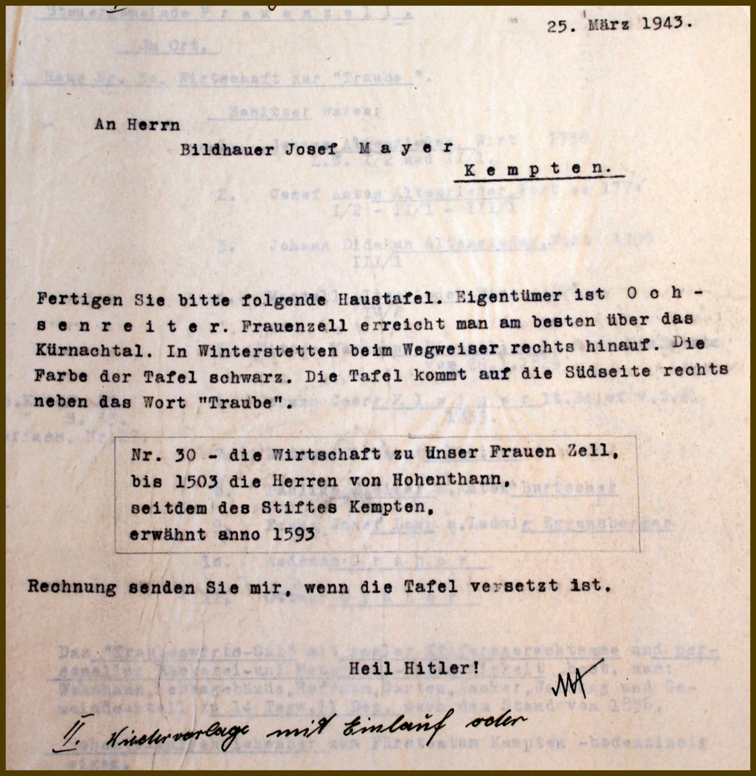 Dr. Otto Merkt schreibt 1943 an den Altusrieder Bildhauer Joseph Mayer zwecks Bestellung einer Tafel. Inschrift: Nr. 30 - die Wirtschaft zu Unser Frauen Zell, bis 1503 die Herrn von Hohenthann, seitdem des Stiftes Kempten, erwähnt anno 1593