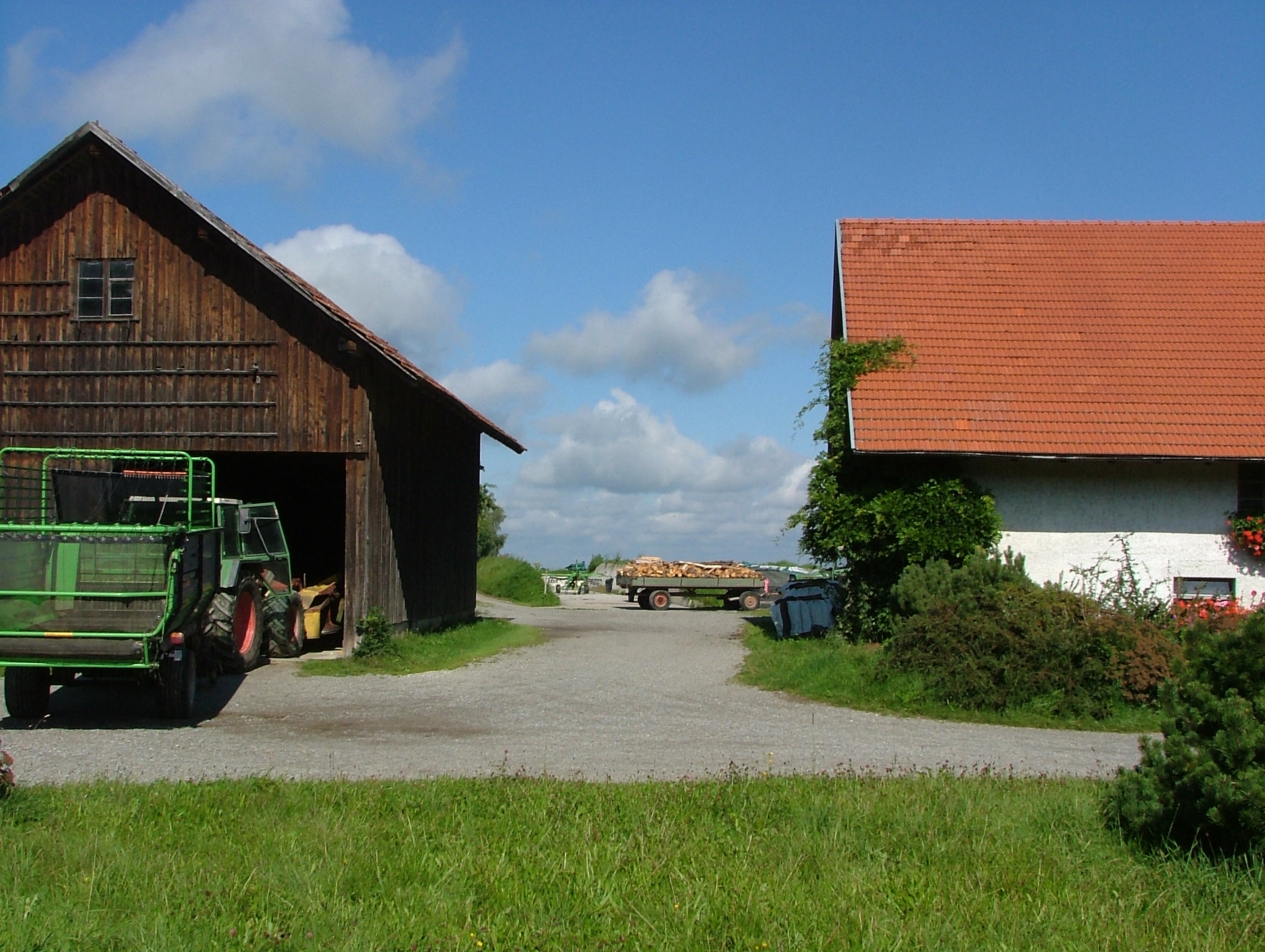 Das ganze Dorf Frauenzell ist aus der Vogelschau dargestellt. Besonders hervorgehoben ist " Johann Reisachers Gastwirtschaft ", die bereits 1593 als Wirtschaft erwähnt wird. Bis um 1770 hieß die Wirtschaft " Zum Hirsch " und seither bis zu ihrem Verkauf 1986 durch Otto Ochsenreiter " Zur Traube". Otto Ochsenreiters Vater Xaver Ochsenreiter hatte die Traube 1919 von Johann Reisacher übernommen; im Laufe der Jahre entstand daraus landläufig der Name " beim Ochsenreiter ". Besonders auffällig ist der Knick in der Ostfassade des Gasthofes, trotzdem fügt sich das Gebäude harmonisch in den Verlauf der Straße ein. - Auf Bild 1 und Bild 4 ist als oberstes, letztes Haus das gemeindeeigene, früher so genannte " Armenhaus " ( heute Haus Lindenbergstraße 2) zu sehen. Im " Armenhaus " fanden seit jeher Bedüftige der Gemeinde eine Bleibe, dies vor allem und in der Zeit nach 1945, als betagte Heimatvertriebene und Flüchtlinge aus dem Osten Deutschlands ( z.B. Schlesien, Sudetenland ) Zuflucht in Frauenzell fanden. Bild 5: Die Traube wie sie früher ausschaute. Vor allem das Dach unterscheidet sich. Das Dach war eingeteilt in zwei Hälften, zuerst ein steiles Dach mit mansardenmäßigen Fenstern, sodann die etwas flachere zweite Hälfte.