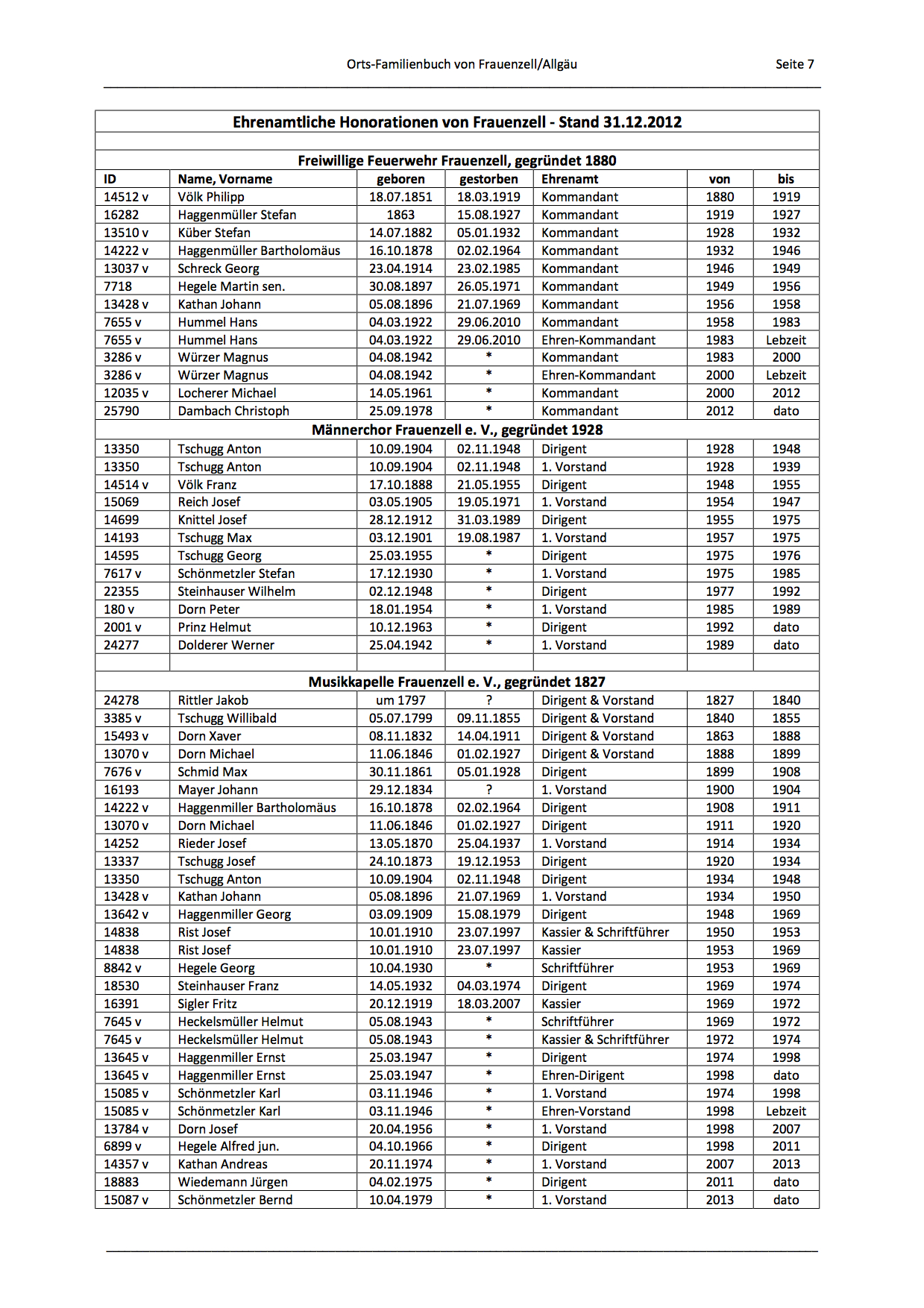 2012 Ehrenamtliche Honorationen von Frauenzell - Stand 31.12.2012
