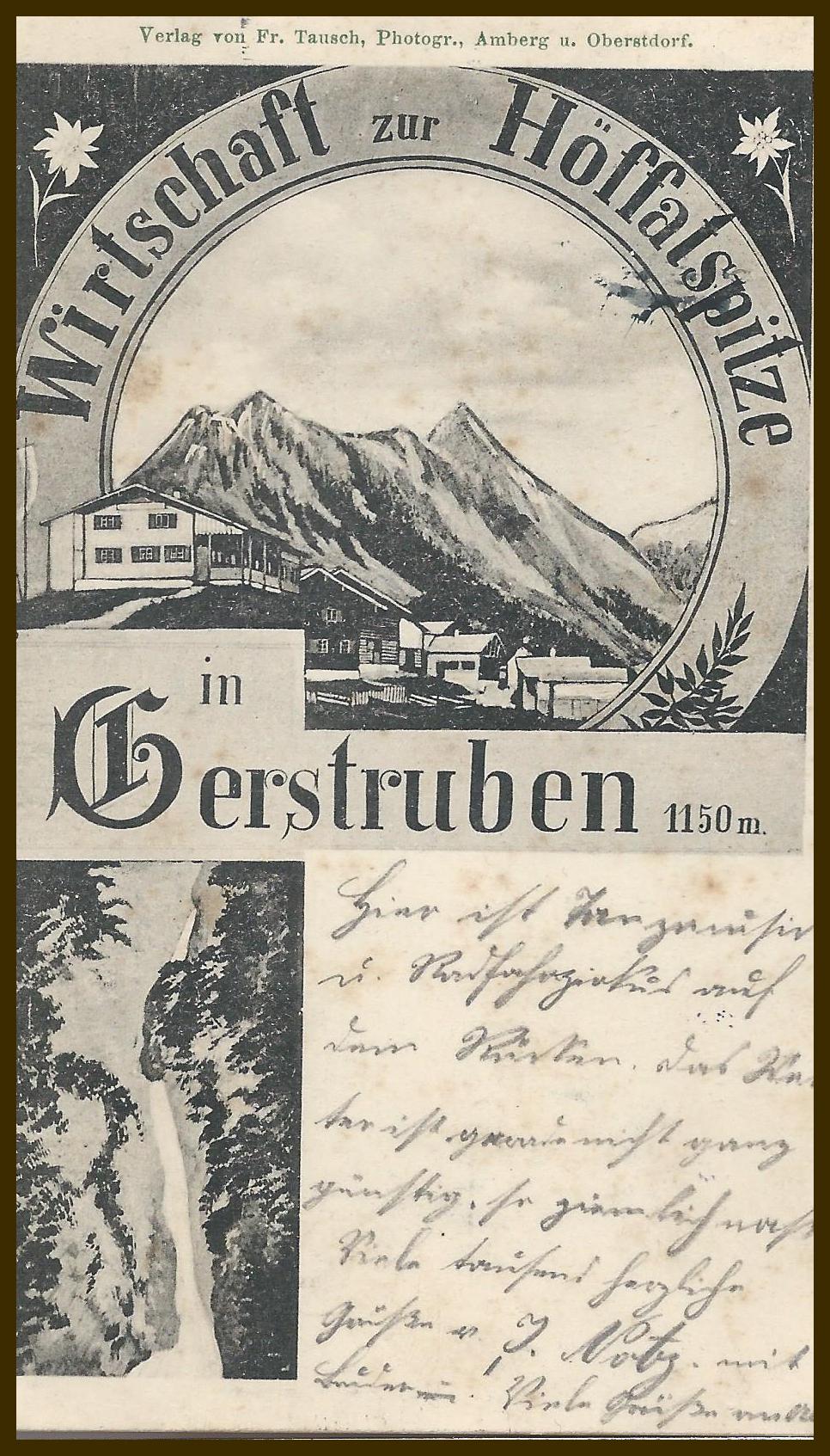 Gabriele Hiemer war Nachbarin von Maria Fähnle. Sie erinnert sich noch an das Austragsstüble, in dem M. Fähnle wohnte. Wichtigstes Möbelstück war ein prächtiger Sekretär mit vielen Schubladen zur Aufbewahrung von allerlei Utensilien. Nur die Postkarten und ein Buch haben die Zeiten überdauert . Bei dem Buch handelt es sich um eine gebundene Beilage zum Allgäuer Volksfreund, Jahrgang 1899. Auf der Innenseite des Einbandes hat Fähnle vermerkt: Eigentum von Maria Fähnle Altusried, 1901. - Darunter mit Bleistift: 30.9. 90 Fridolin Daiser, nicht verkaufen, könnte sehr wertvoll sein, aber noch warten.