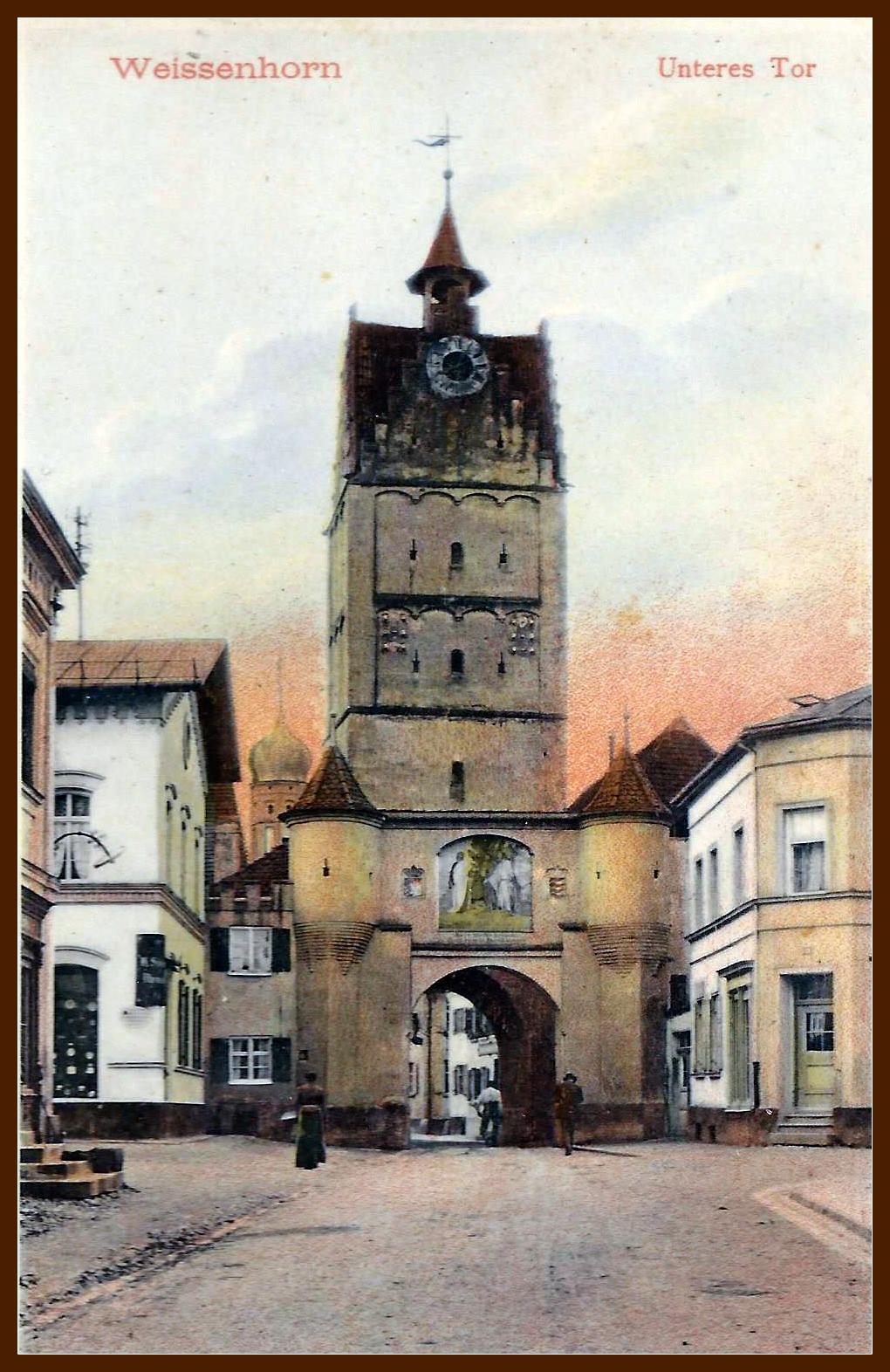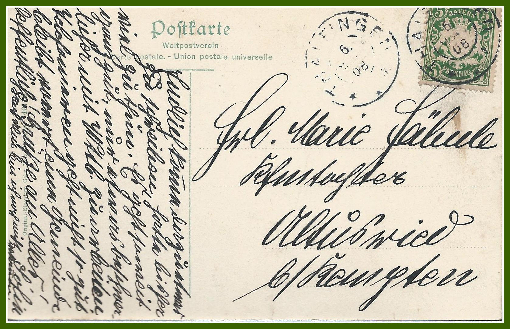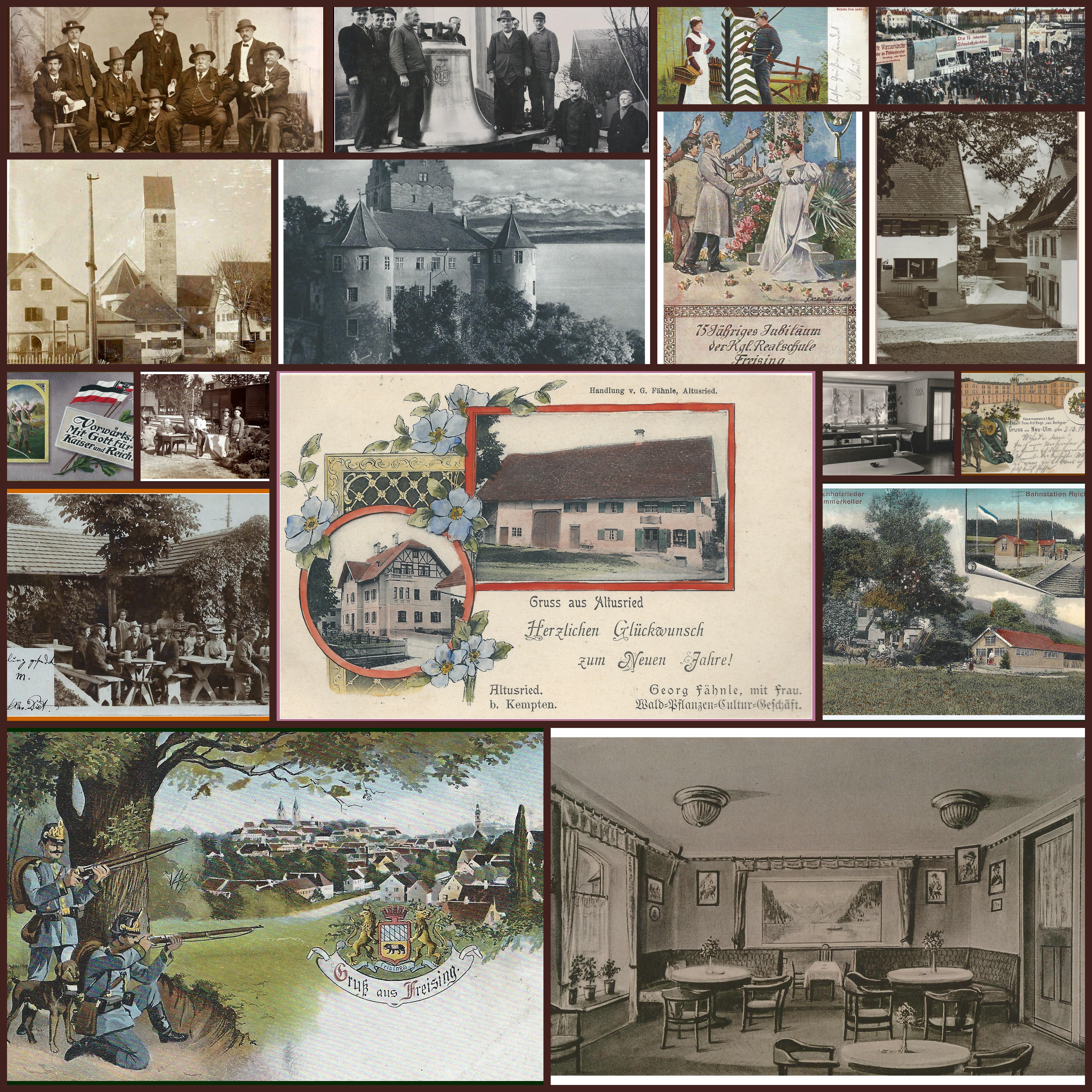Postkarte an Senzi Maier ( aus der Fähnleverwandtschaft ) mit den Motiven Bahnstation Reicholzried und Sommerkeller. Die Bahnstationen waren damals noch von erheblicher Bedeutung.Die Bahnstation Reicholzried am Schorenmoos war die Altusried nächst gelegene Bahnstation. Man erreichte den Bahnhof über die Illerfähre bei Buch und den Ort Reicholzried. Den Nachbarort schrieb man damals noch mit Doppel h, also Reichholzried. Der Ortsname bedeutet aber nicht reich an Holz, sondern kommt von Richoldsried, das heißt Rodung des Richold.