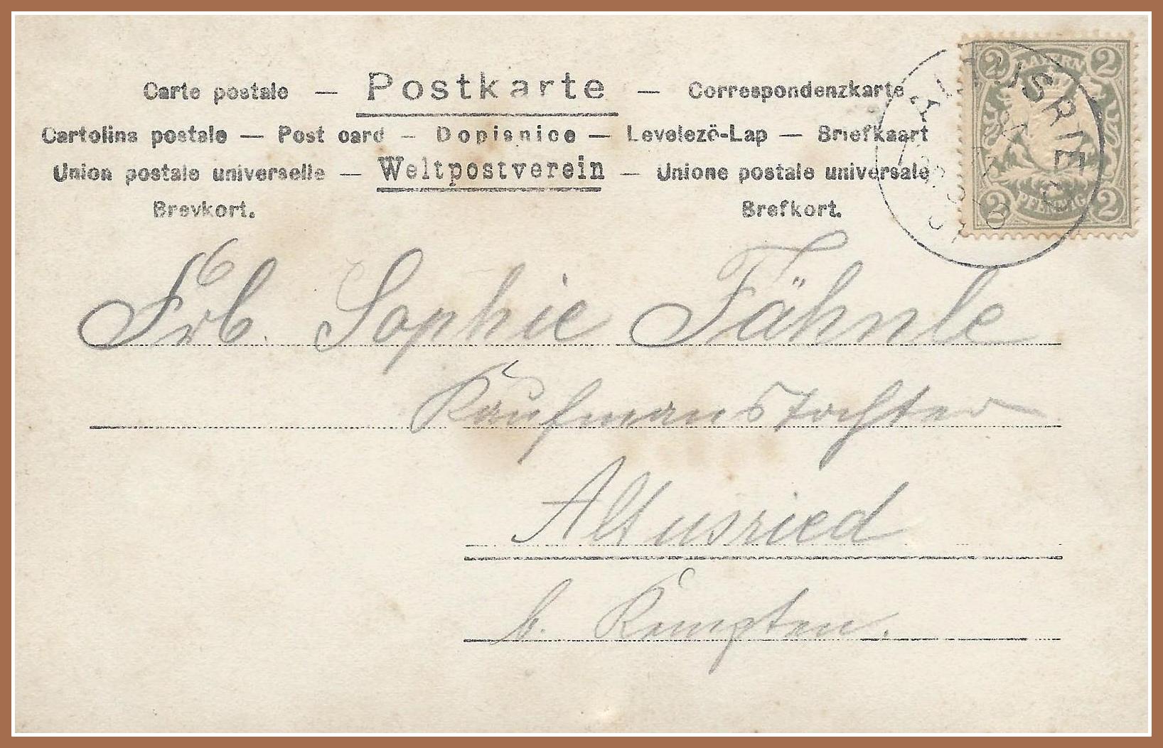 Die Tochter von Georg Fähnle war Maria Fähnle. Sie war die Adressatin von vielen Bildpostkarten, die sie sorgsam aufbewahrte. Maria blieb ledig und wohnte im Austragsstüble. Auf den Postkarten hieß die Anrede zumeist: Wohlgeboren Fräulein Fähnle Maria Kaufmannstochter in Altusried bei Kempten.