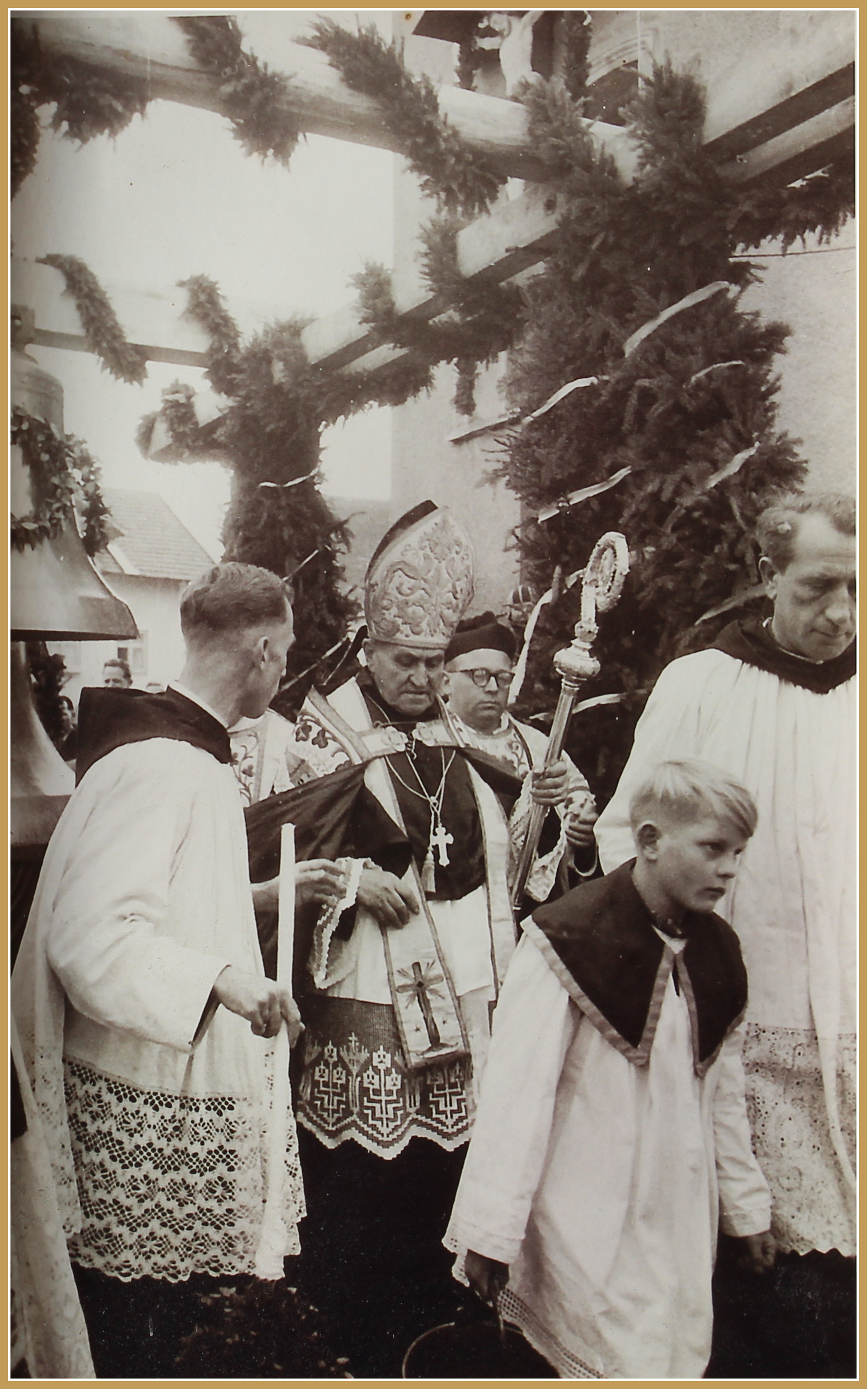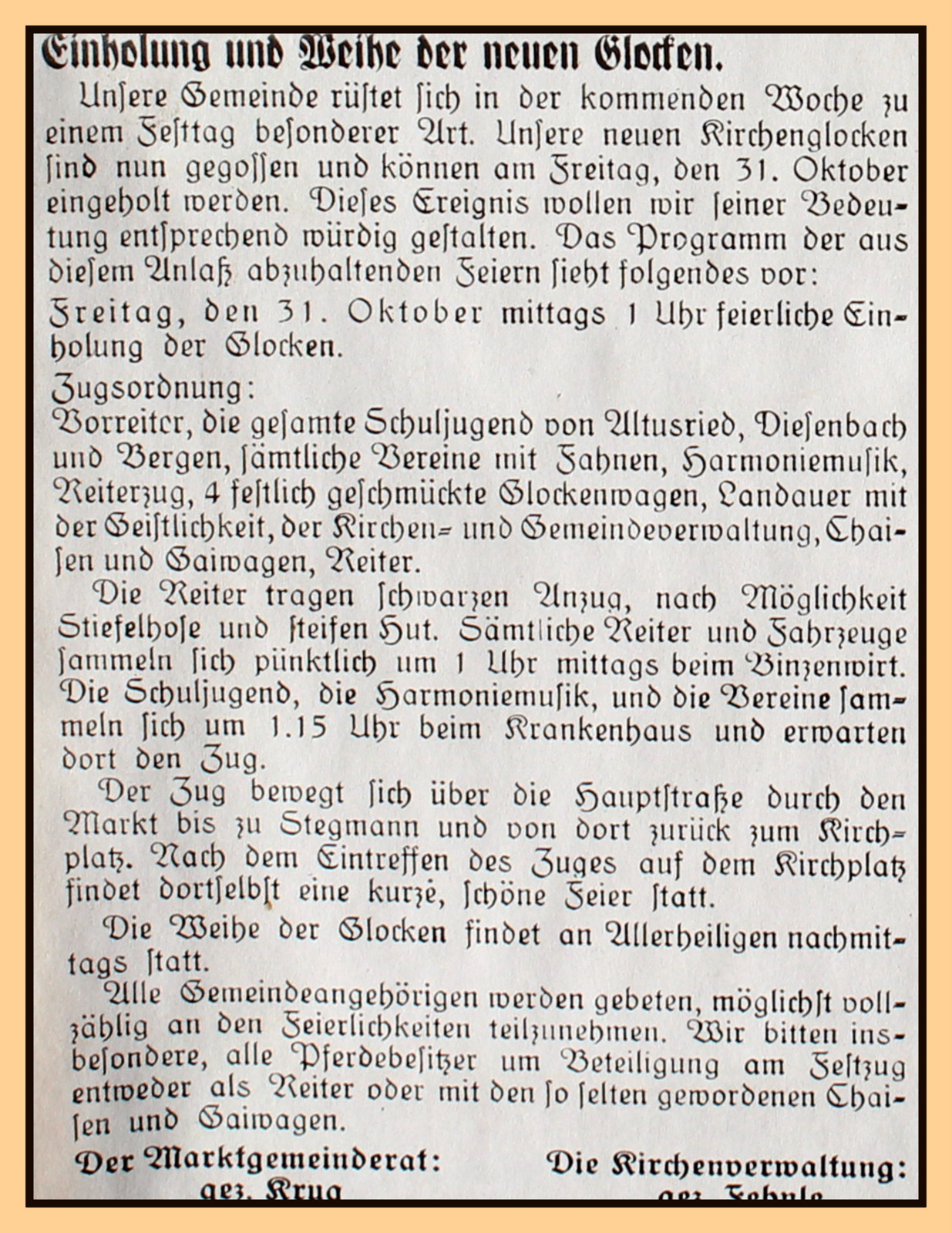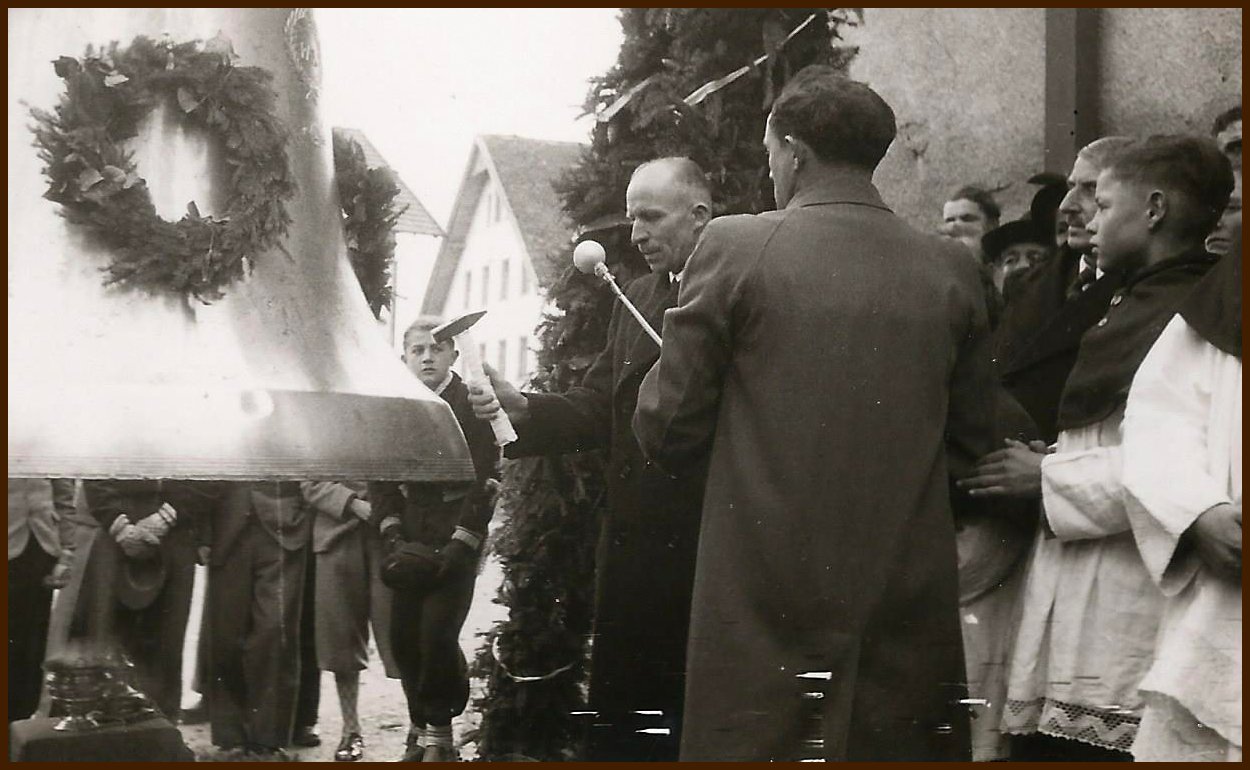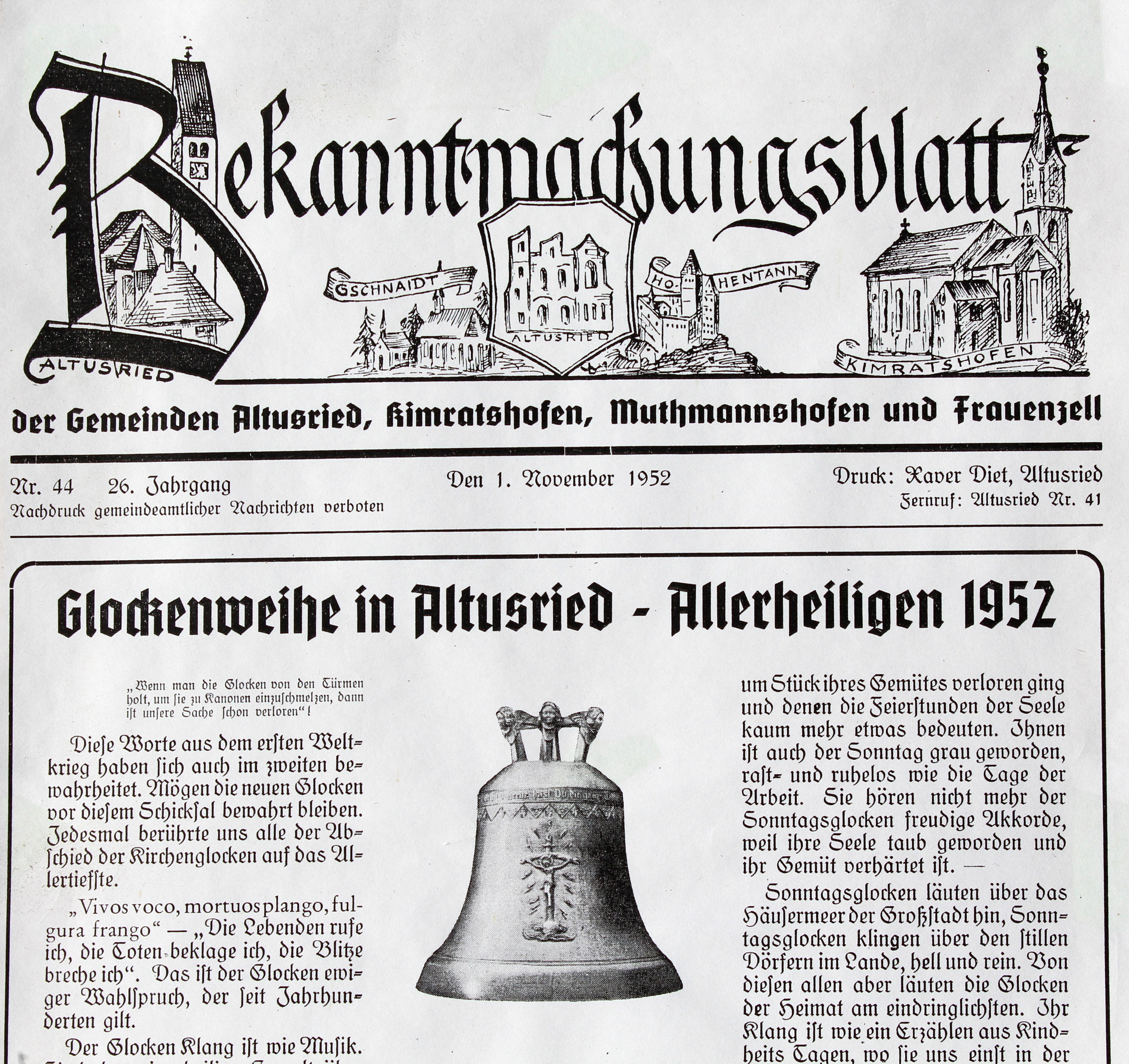 Die Glockenweihe war ein großes Ereignis. Es wurde nun allen offenbar, die Kriegszeiten sind vorbei. Der Friede ist da. Auf feierliche Weise wurden die Glocken eingeholt. So wie eine hochgestellte Persönlichkeit wurden sie am Ortsrand empfangen und zur Kirche geleitet. Reiter, Schuljugend, die Harmoniemusik, Vereine,Wagen und Kutschen begleiteten sie. Die Weihe durch den Ottobeurer Abt und gebürtigen Altusrieder Joseph Maria Einsiedler geschah am nächsten Tag, Allerheiligen, den 1. November 1952. Fotos von Siegfried Bösele.