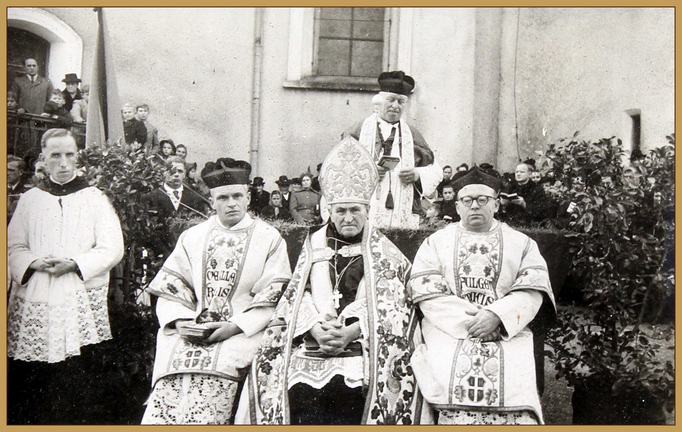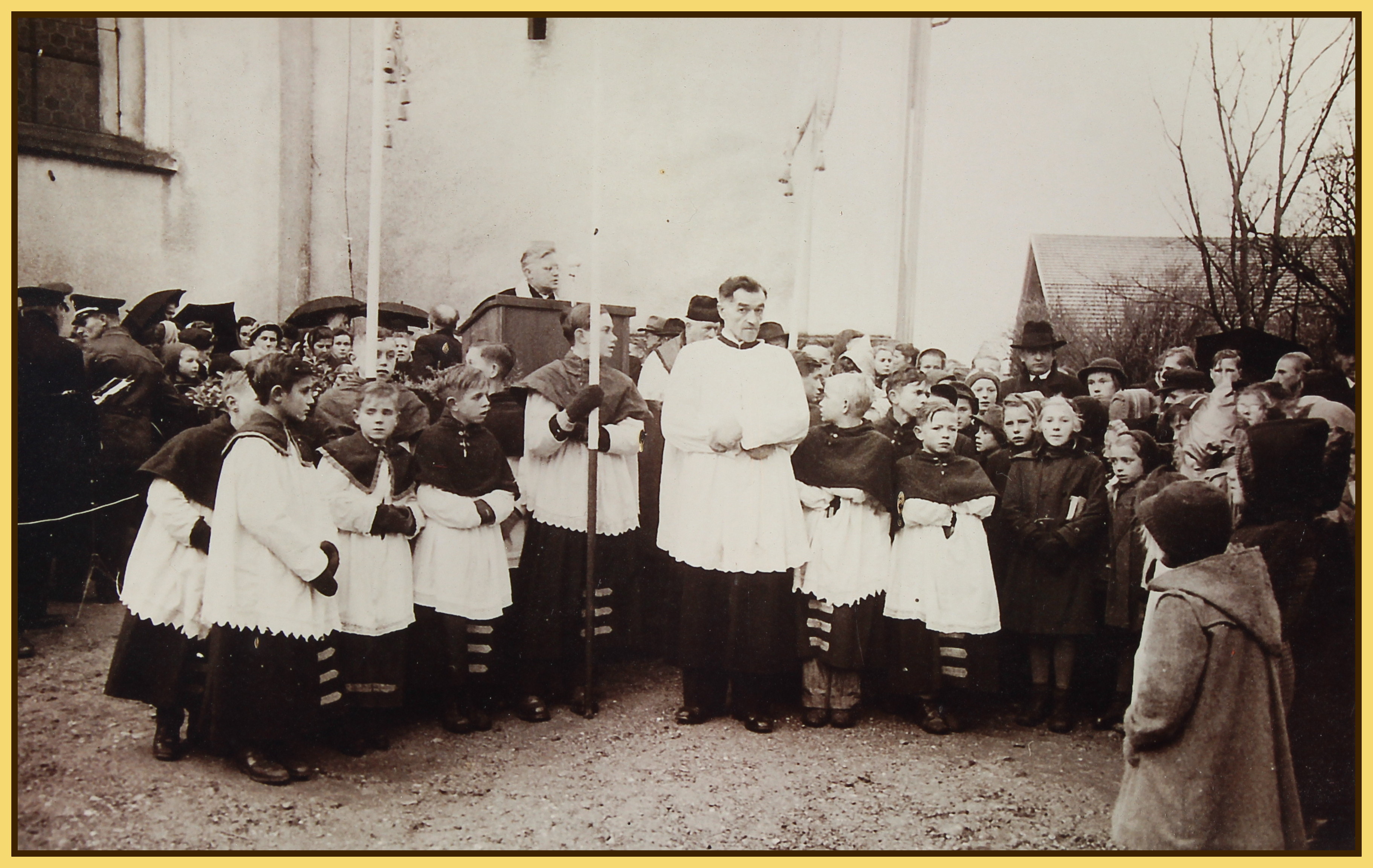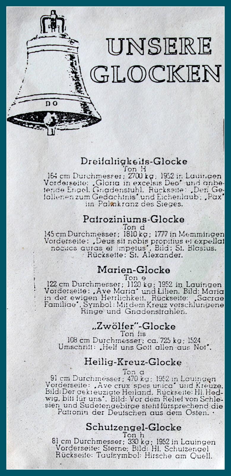 Die Glockenweihe war ein großes Ereignis. Es wurde nun allen offenbar, die Kriegszeiten sind vorbei. Der Friede ist da. Auf feierliche Weise wurden die Glocken eingeholt. So wie eine hochgestellte Persönlichkeit wurden sie am Ortsrand empfangen und zur Kirche geleitet. Reiter, Schuljugend, die Harmoniemusik, Vereine,Wagen und Kutschen begleiteten sie. Die Weihe durch den Ottobeurer Abt und gebürtigen Altusrieder Joseph Maria Einsiedler geschah am nächsten Tag, Allerheiligen, den 1. November 1952. Fotos von Siegfried Bösele.