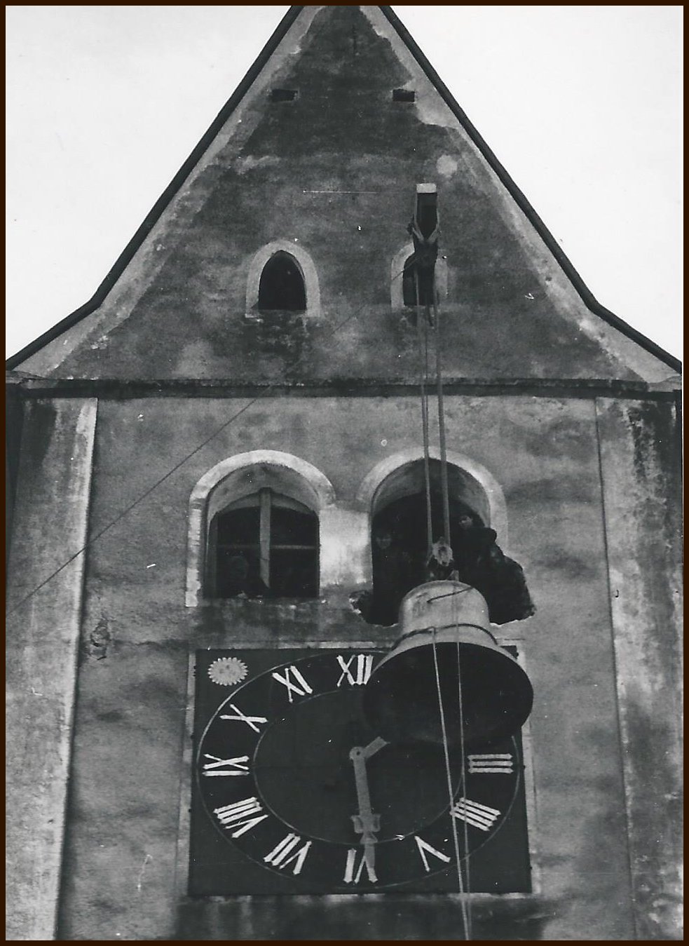 Die neuen Glocken waren zu groß, deshalb mussten die Rundbogenfenster unten ausgebrochen werden. Am Zustand des Turmes erkennt man auch, dass der Turm jahrzehntelang nicht mehr renoviert worden war. Weder in der Kriegszeit noch in der ersten Nachkriegszeit gab es hierfür die Mittel.