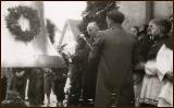 Pfarrer Miller bei der Einweihung, ein Ministrant hält einen Hammer bereit.