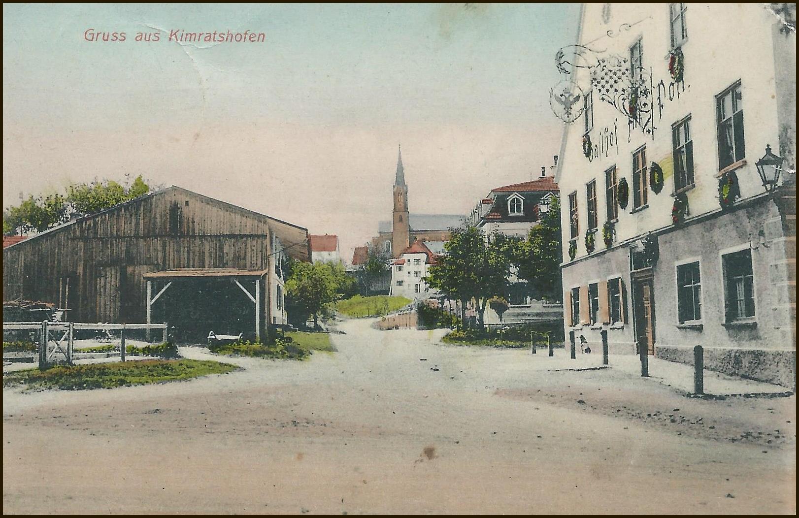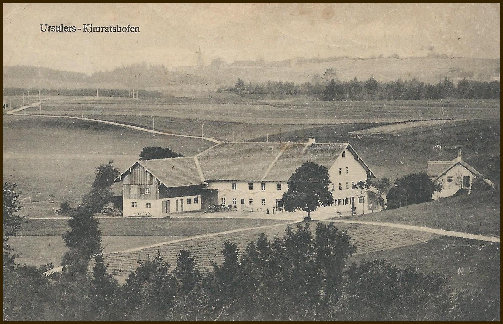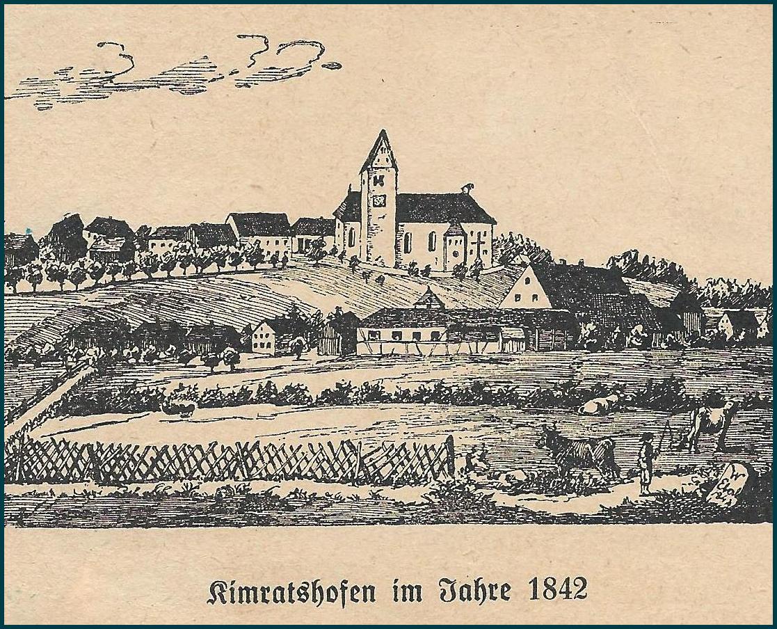 173 Jahre und fünf Generationen sind vergangen. Wir sehen Kimratshofen, wie es war. Auf dem Berg steht der Vorgängerbau der heutigen Kirche . Von ihr blieb nur der Turm aus Tuffstein, er wurde aber durch einen Aufbau im neugotischen Stil wesentlich erhöht. Im Vordergrund eine Weide mit drei Kühen und dem Hirten, umgeben von einem Holzzaun. Man sieht es sind zwei Dörfer, Oberhofen auf dem Berg mit der Kirche und in der Ebene Kimratshofen.