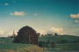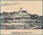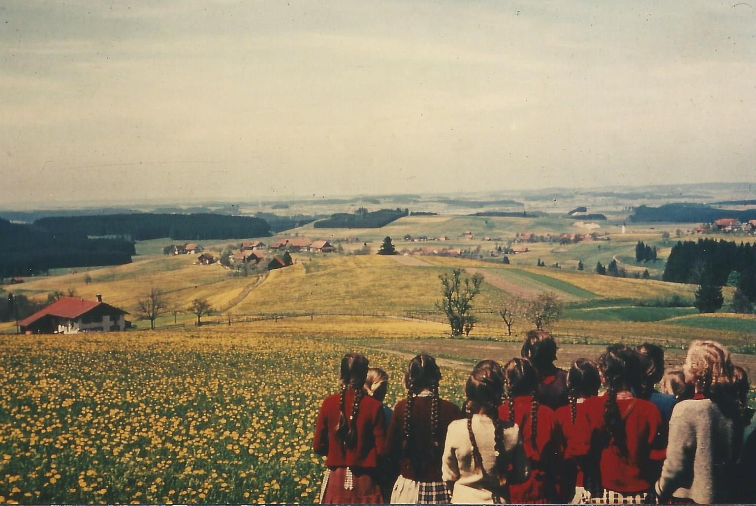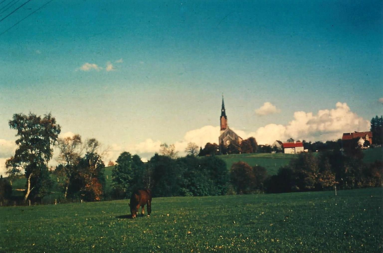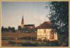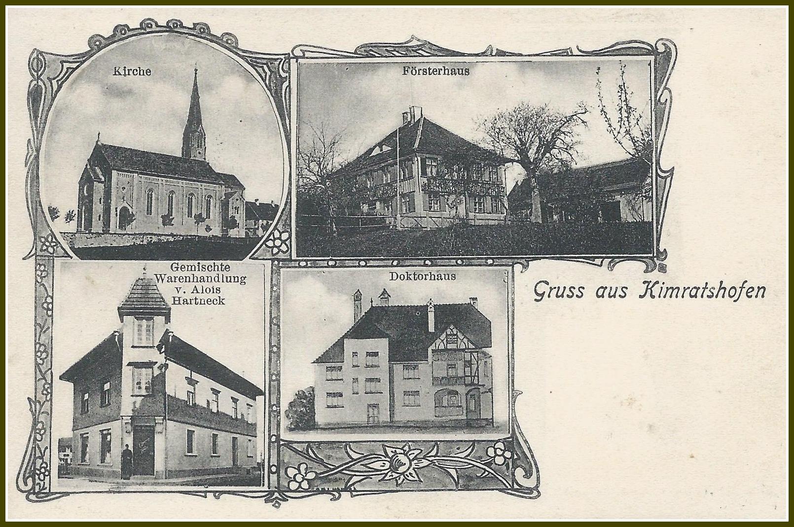 173 Jahre und fünf Generationen sind vergangen. Wir sehen Kimratshofen, wie es war. Auf dem Berg steht der Vorgängerbau der heutigen Kirche . Von ihr blieb nur der Turm aus Tuffstein, er wurde aber durch einen Aufbau im neugotischen Stil wesentlich erhöht. Im Vordergrund eine Weide mit drei Kühen und dem Hirten, umgeben von einem Holzzaun. Man sieht es sind zwei Dörfer, Oberhofen auf dem Berg mit der Kirche und in der Ebene Kimratshofen.