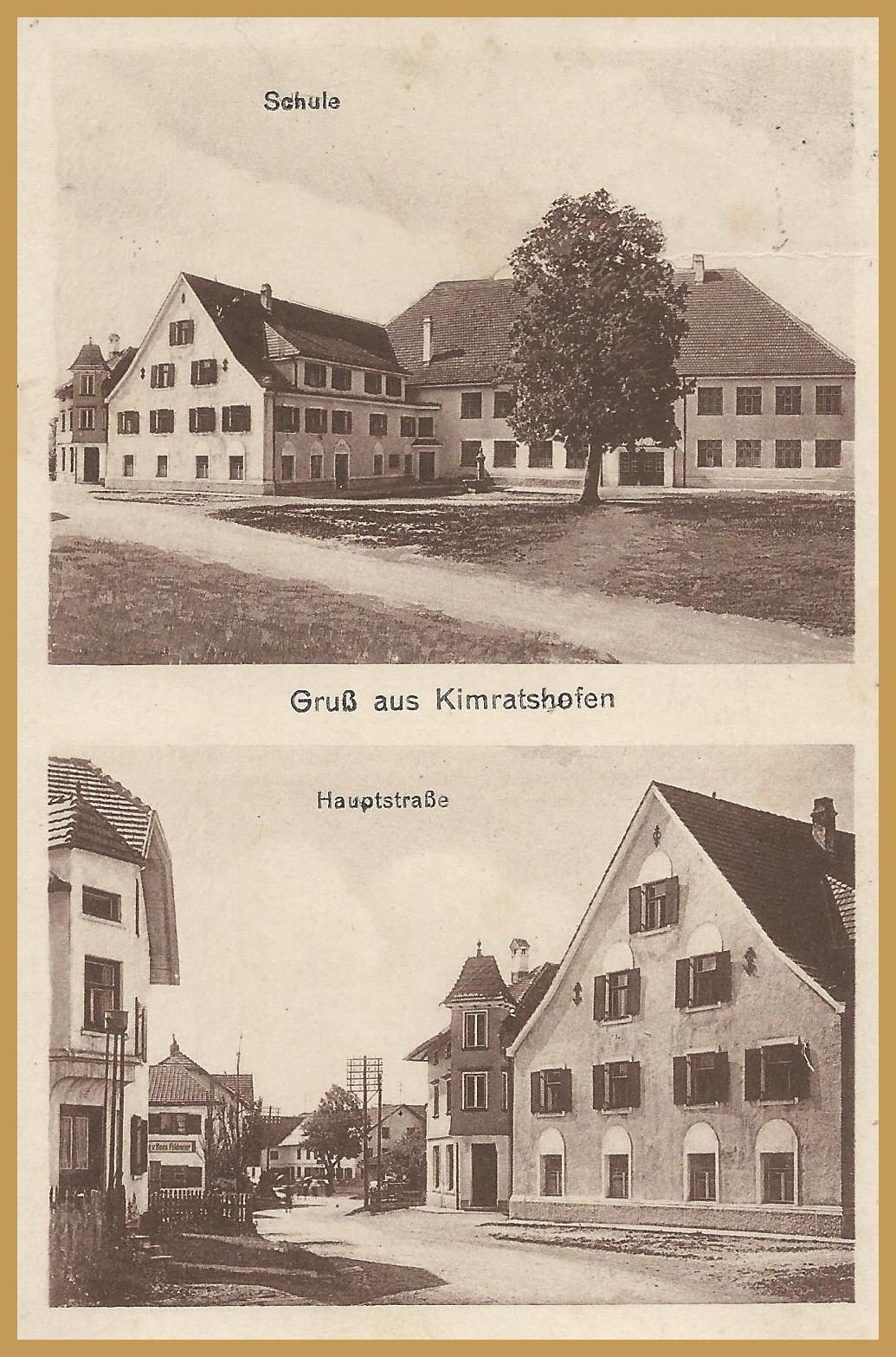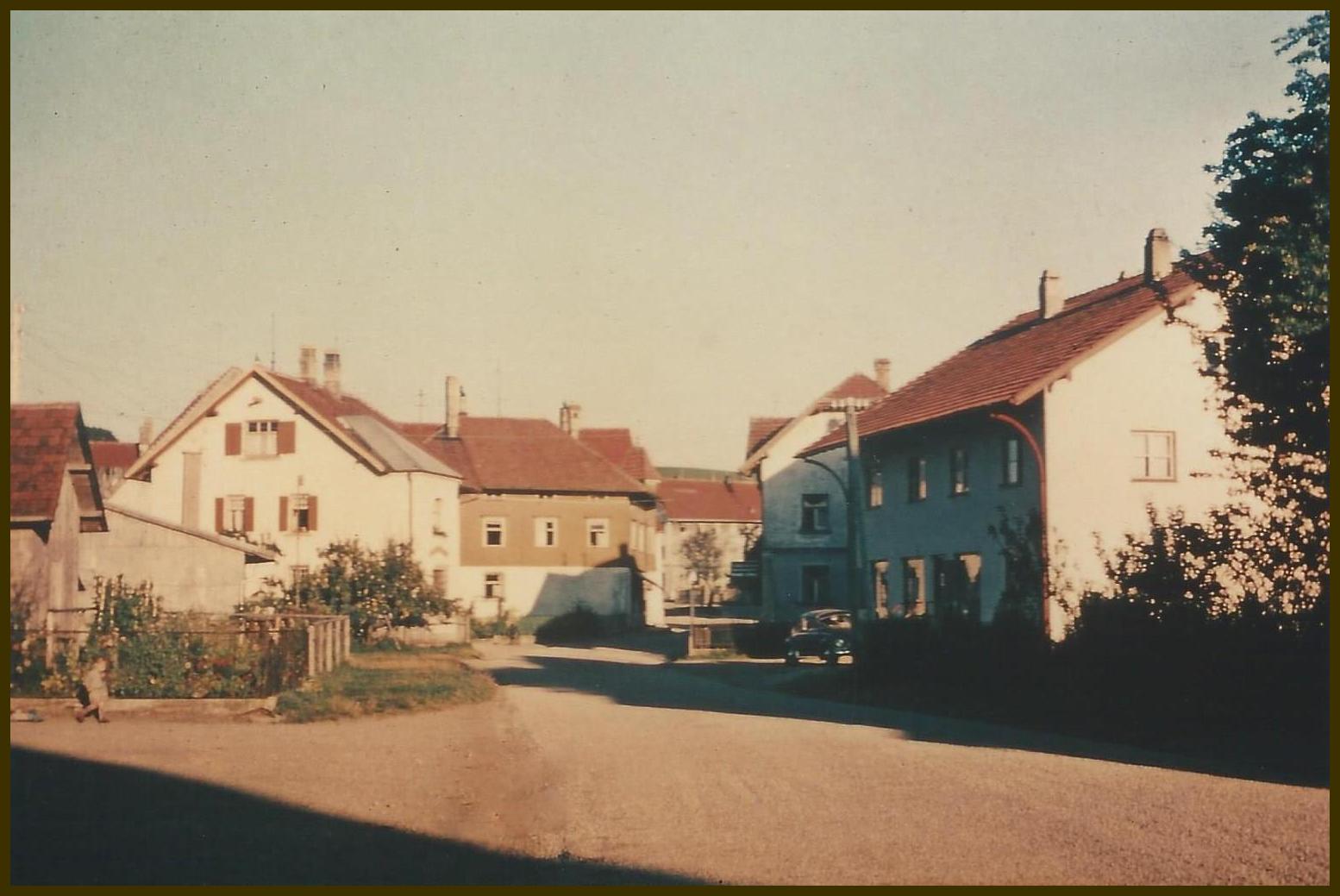 - Schule und Hauptstraße 1927. Links vor dem Stiefenhofer Haus ist eine Widderpumpe. Dieser Mechanismus nutzt den Druckstoß um einen Teil des Wassers, mit dem die Pumpe angetrieben wird, auf ein höheres Niveau zu heben.