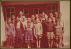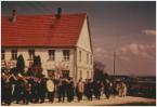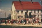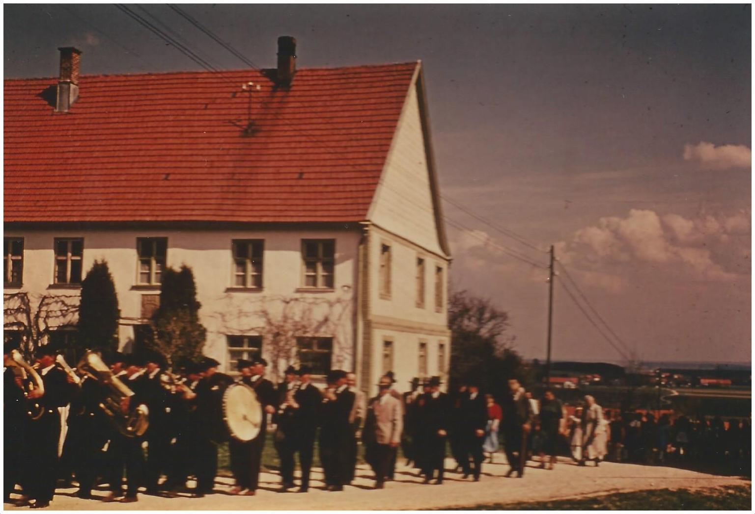 - Die Blasmusik marschiert am alten Pfarrhaus vorbei. Leider wurde der Pfarrhof abgerissen.